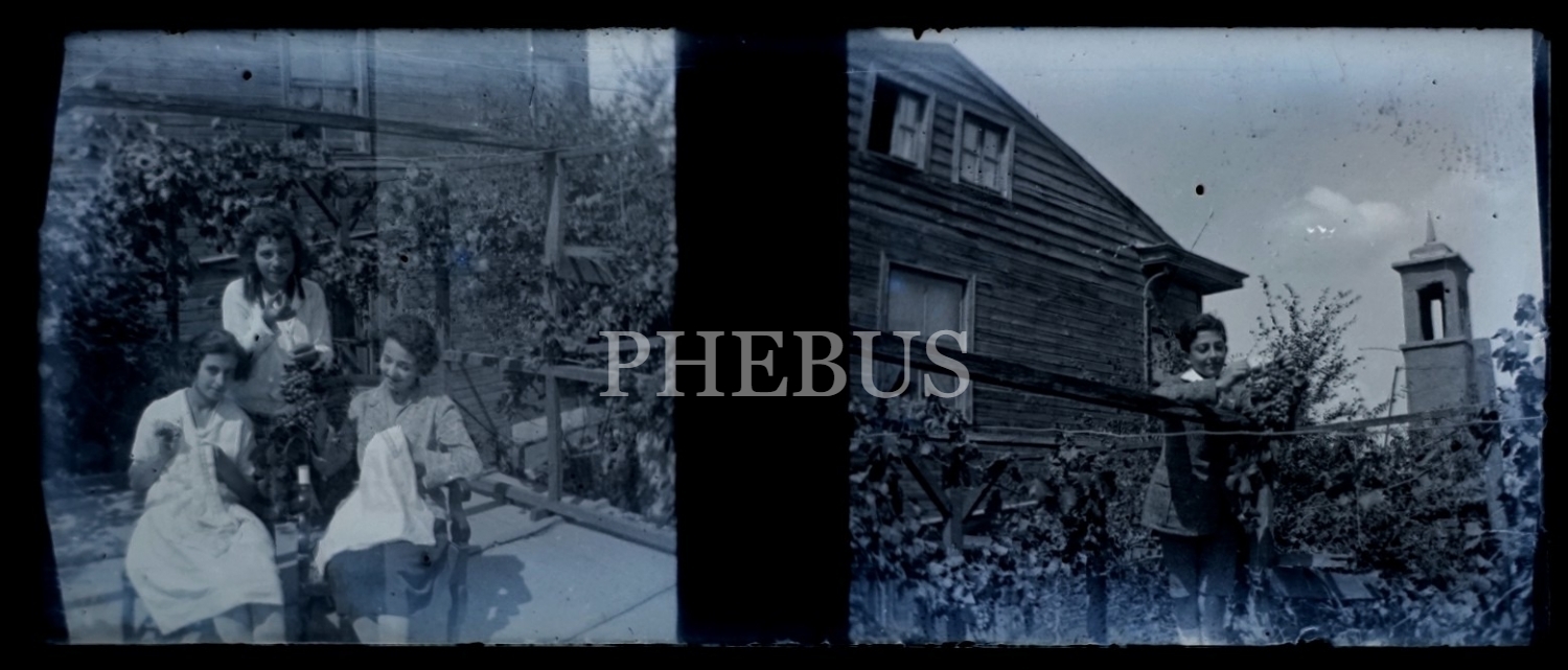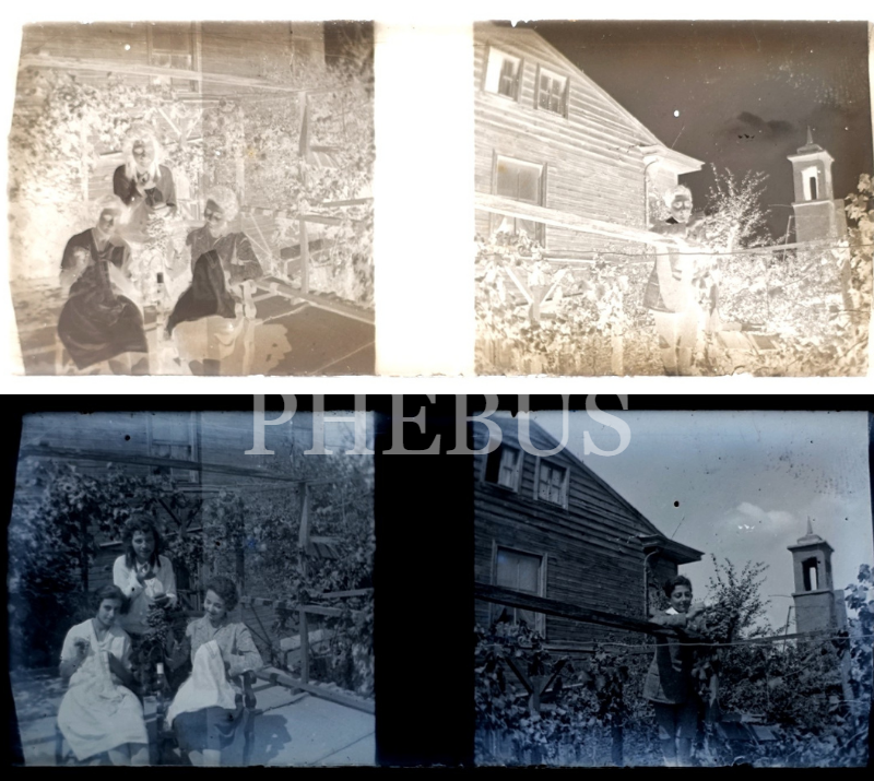 Evlerinin bahçesinde oturan hanımların göründüğü cam negatif, 10x4 cm...