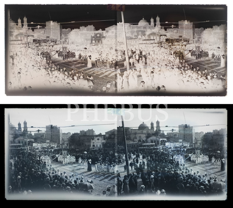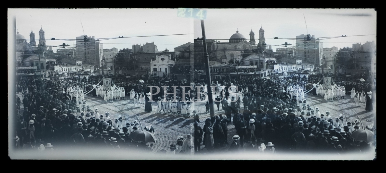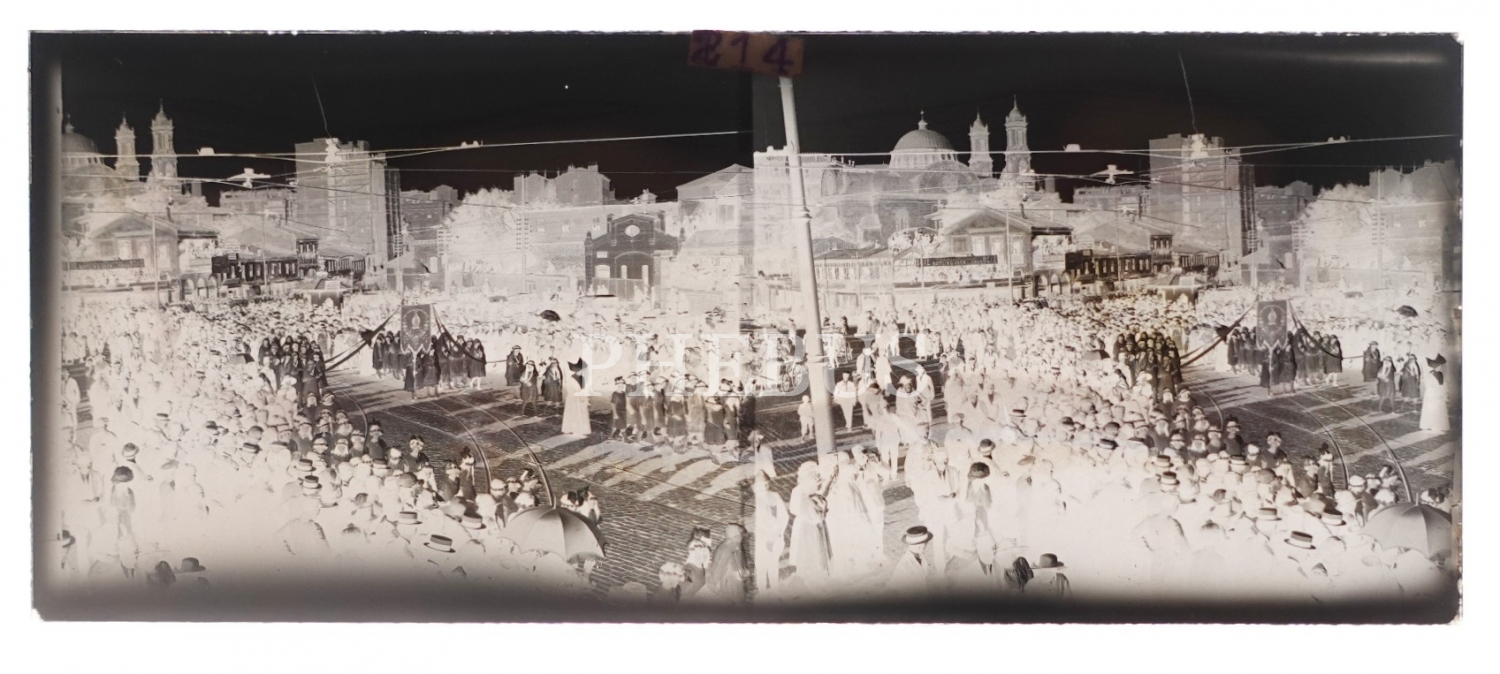 Taksim Meydanı´nda sancakları ile geçit töreni yapan Katolik cemaatinin göründüğü iki kareli cam negatif, 11x4 cm...