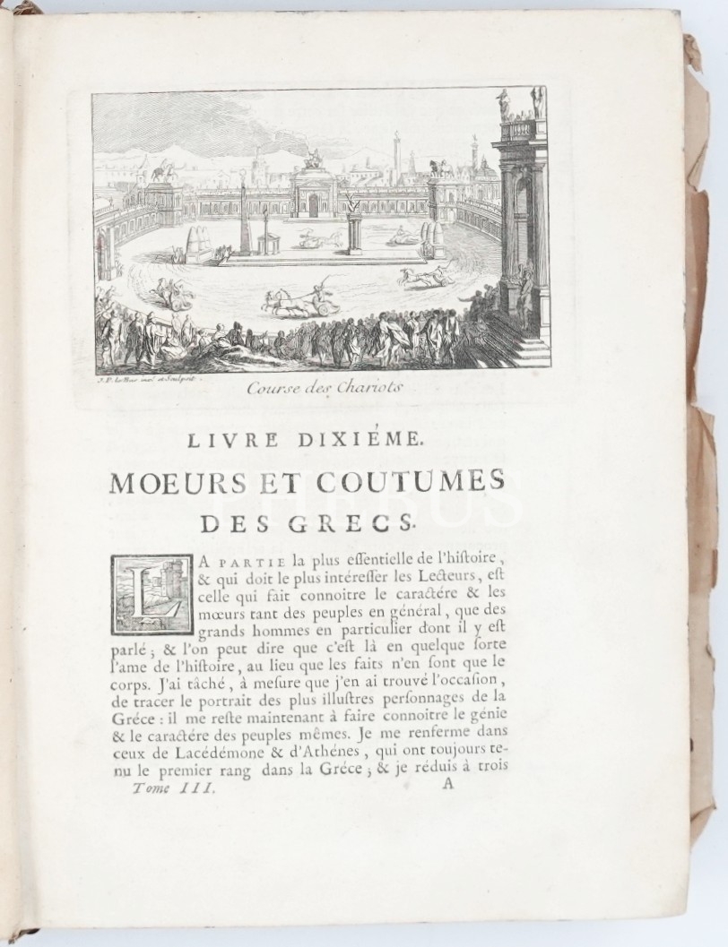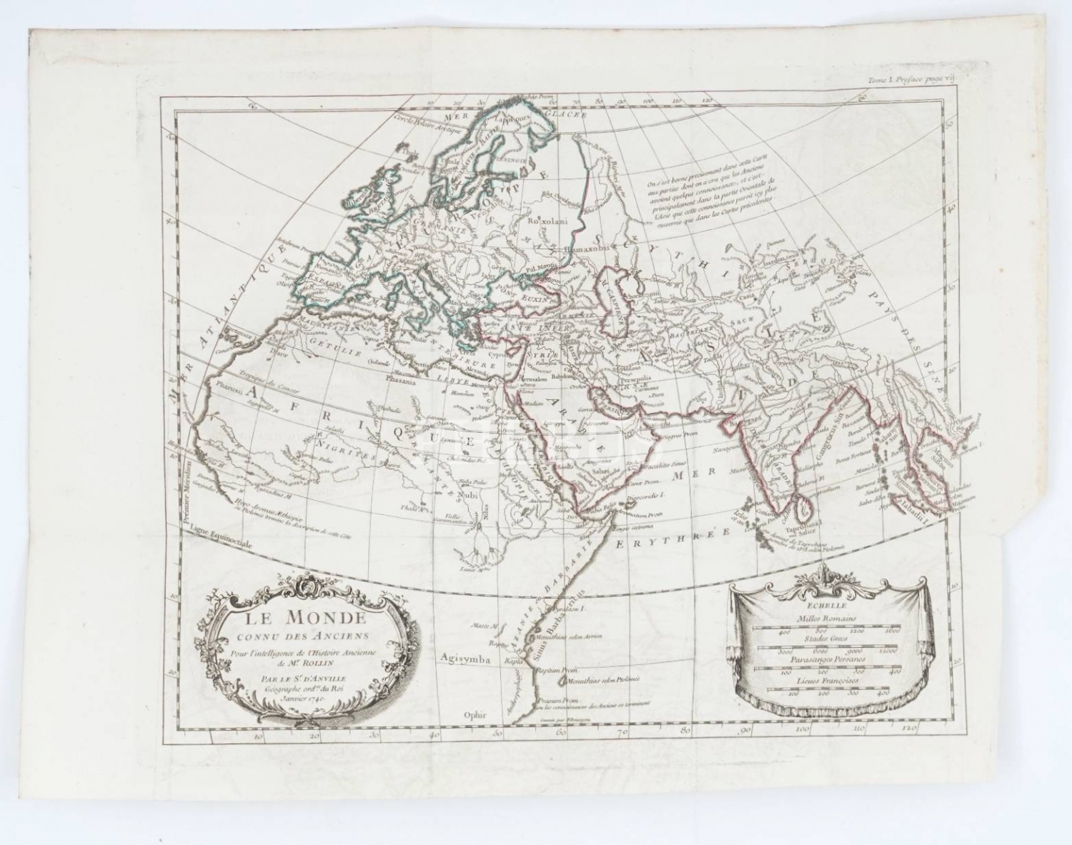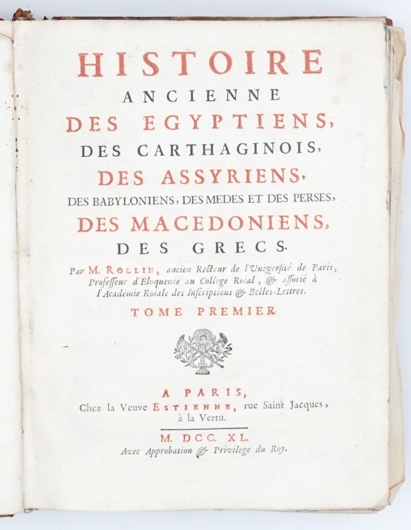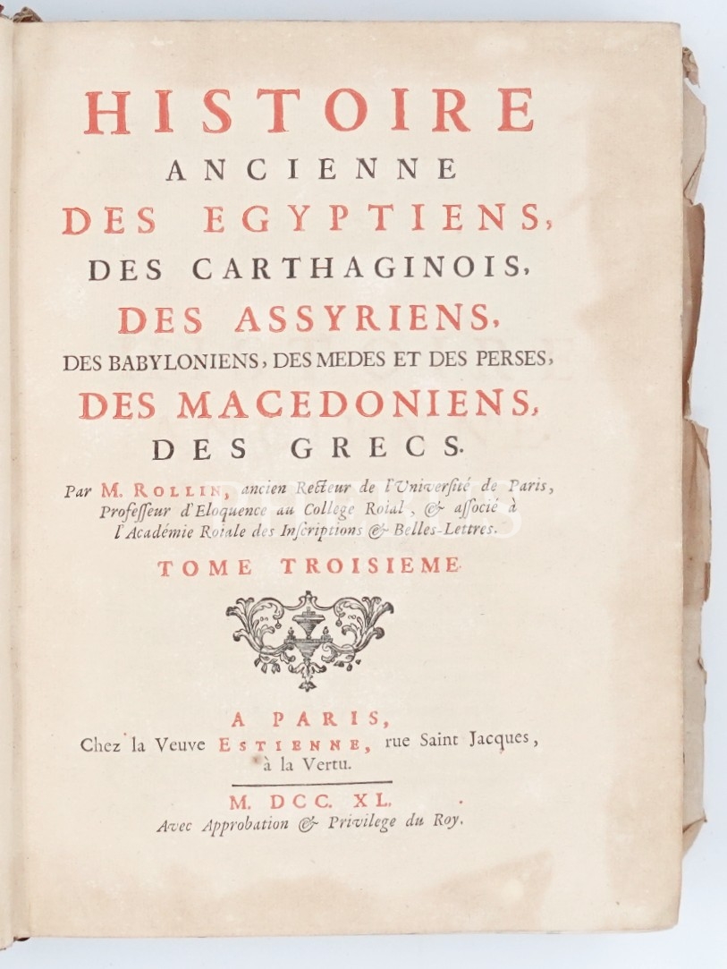 Fransız tarihçi ve eğitimci Charles Rollin (1661-1741) tarafından kaleme alınan ve antik medeniyetlere kapsamlı bir bakış sunan "Antik Tarih" çalışmasının ilk üç cildi... Eserde renkli ve renksiz çok sayıda katlanır levha mevcuttur (Cilt 1: 5 harita, cilt 2: biri Anadolu olmak üzere 2 harita, cilt 3: biri Anadolu olmak üzere 2 harita). Sayfa kenarları ve iç kapakları ebrulu, sırtı yaldız süslemeli orijinal deri cildinde. *Ciltler yıpranmıştır.
