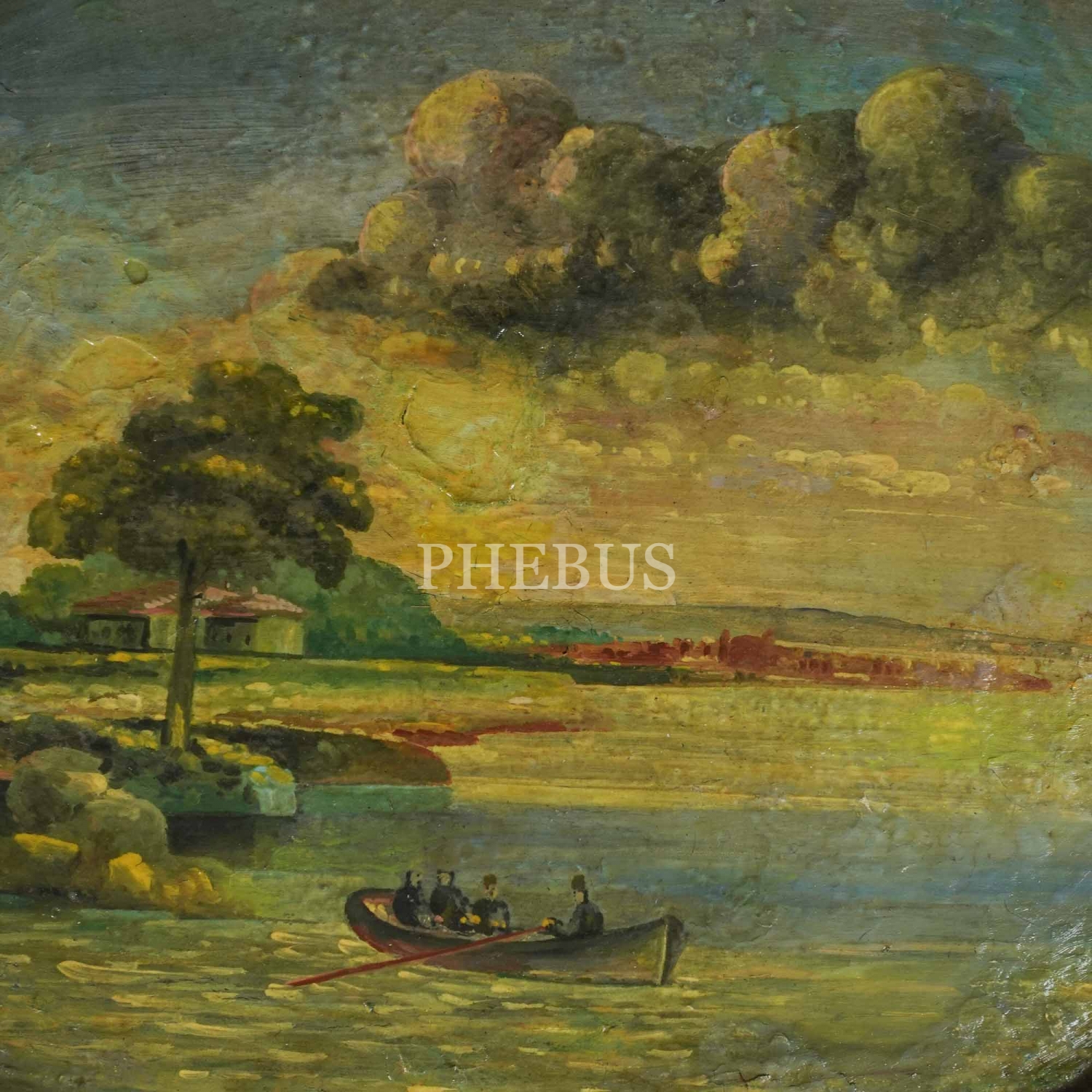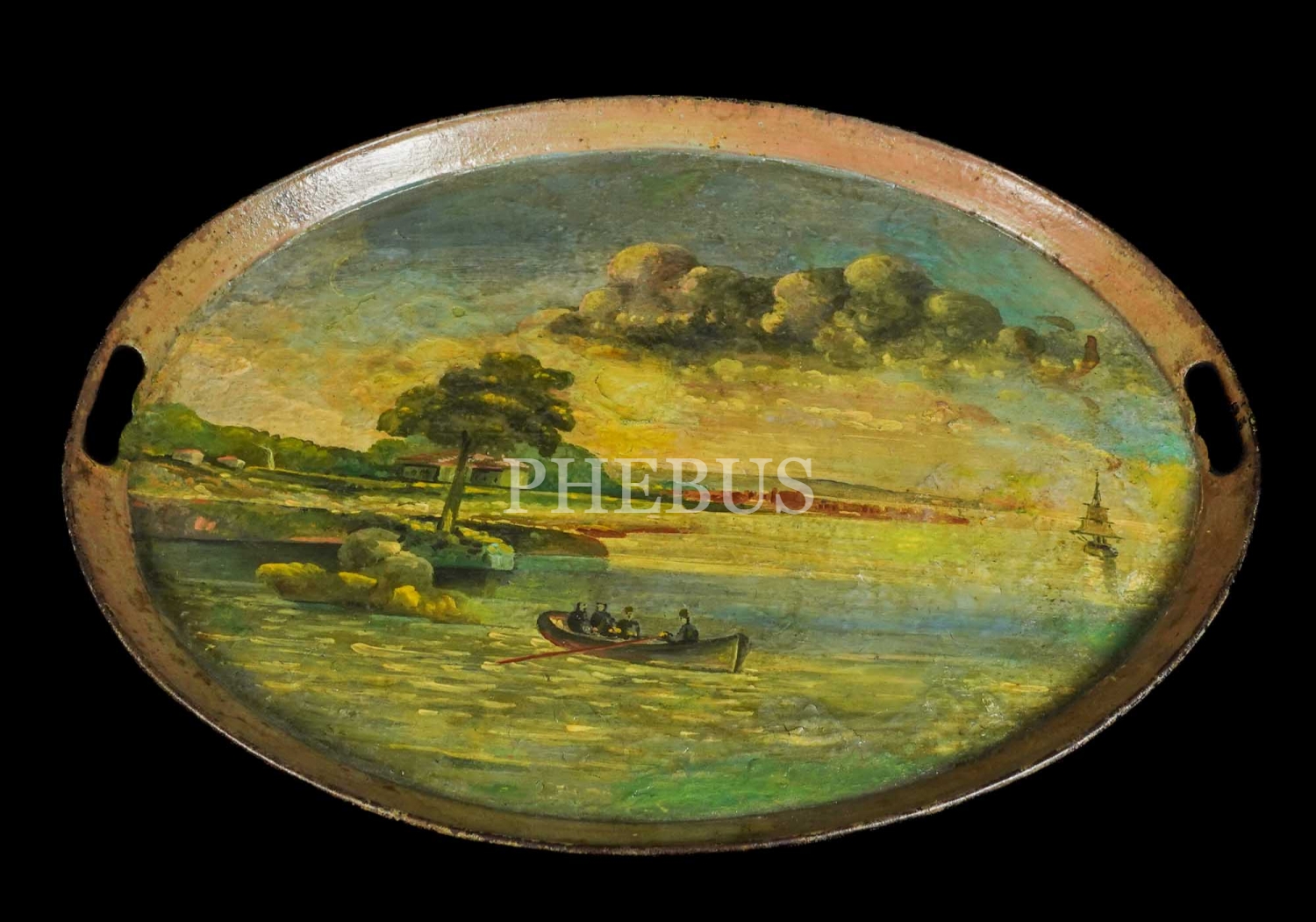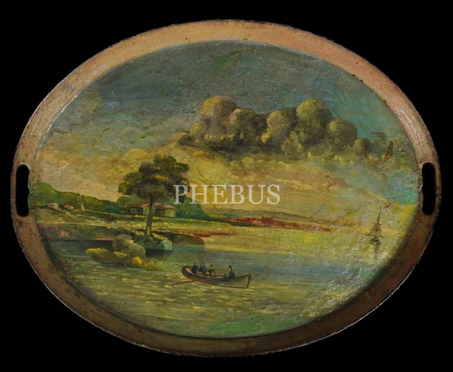 19. yüzyıldan kayıkla göl gezintisi yapan fesli tipler görselli Pulat tepsi, 44x56 cm...