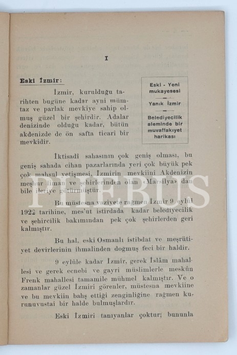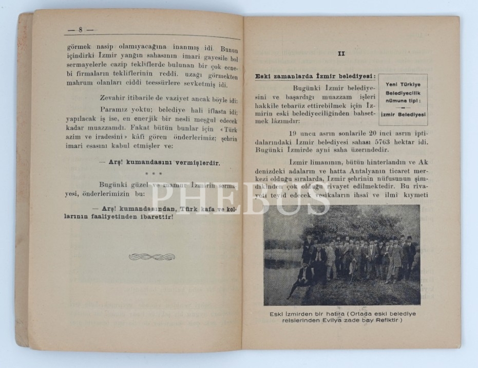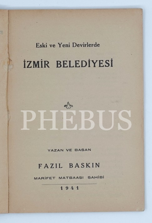 ESKİ VE YENİ DEVİRLERDE İZMİR BELEDİYESİ, yazan ve basan: Fazıl Baskın (Marifet Matbaası sahibi), 1941, 72 sayfa, 14x20 cm...