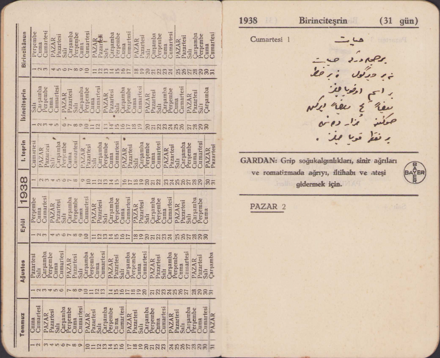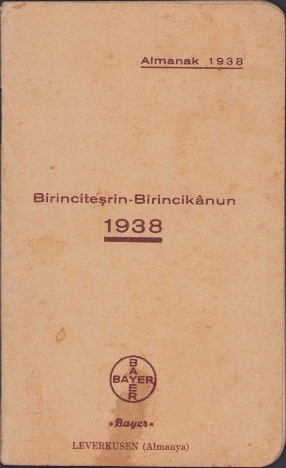 Bayer almanak, 1938 tarihli, içi Osmanlıca yazılı