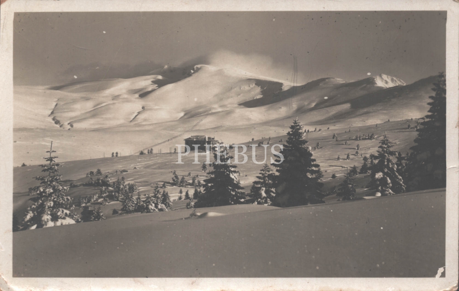 Karlı dağın eteklerinde bir kayak oteli, 14x9 cm...