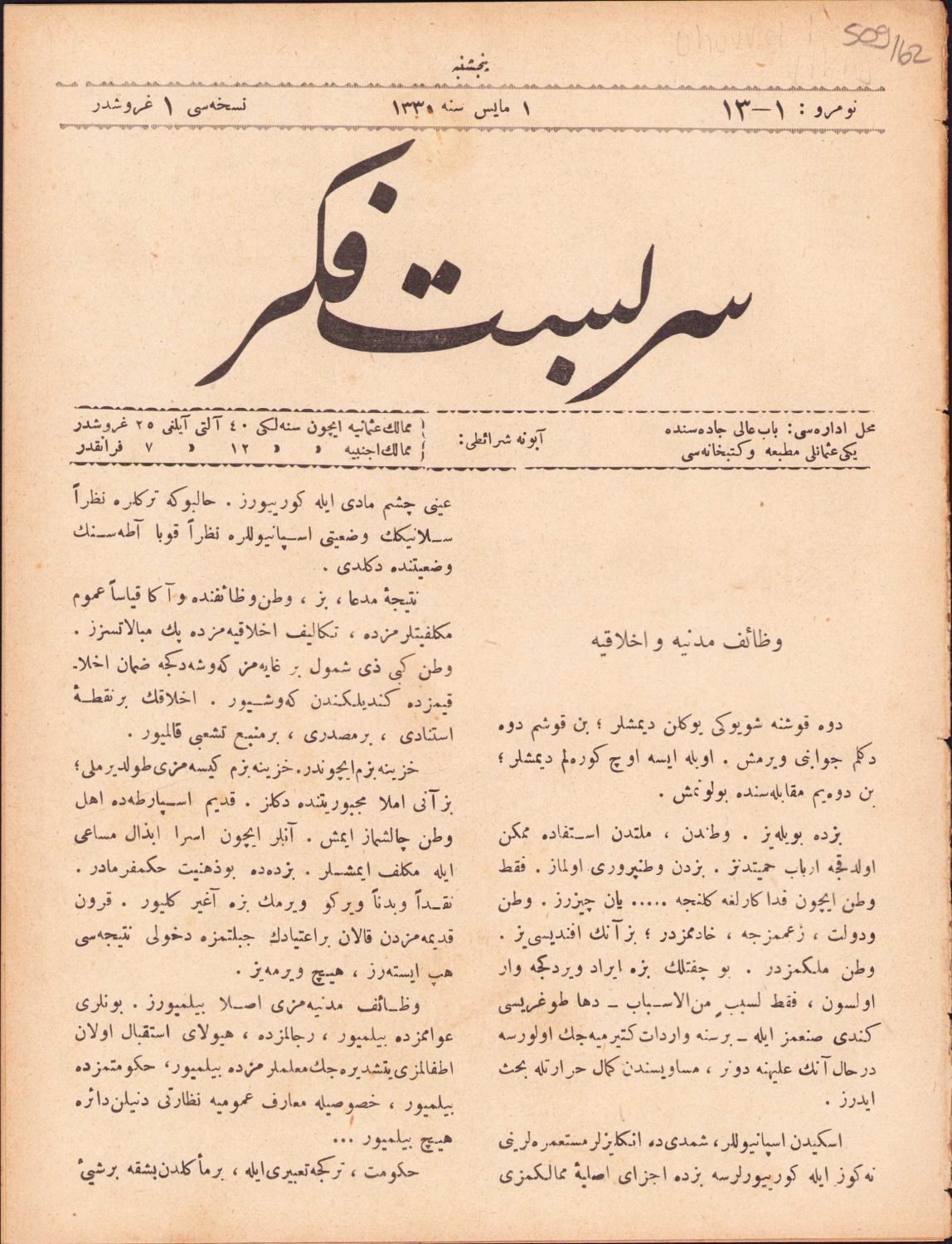 Osmanlıca Serbest Fikir mecmuası, 1330, 1-13 numaraları, resimli, 16 sayfa, 18x25 cm