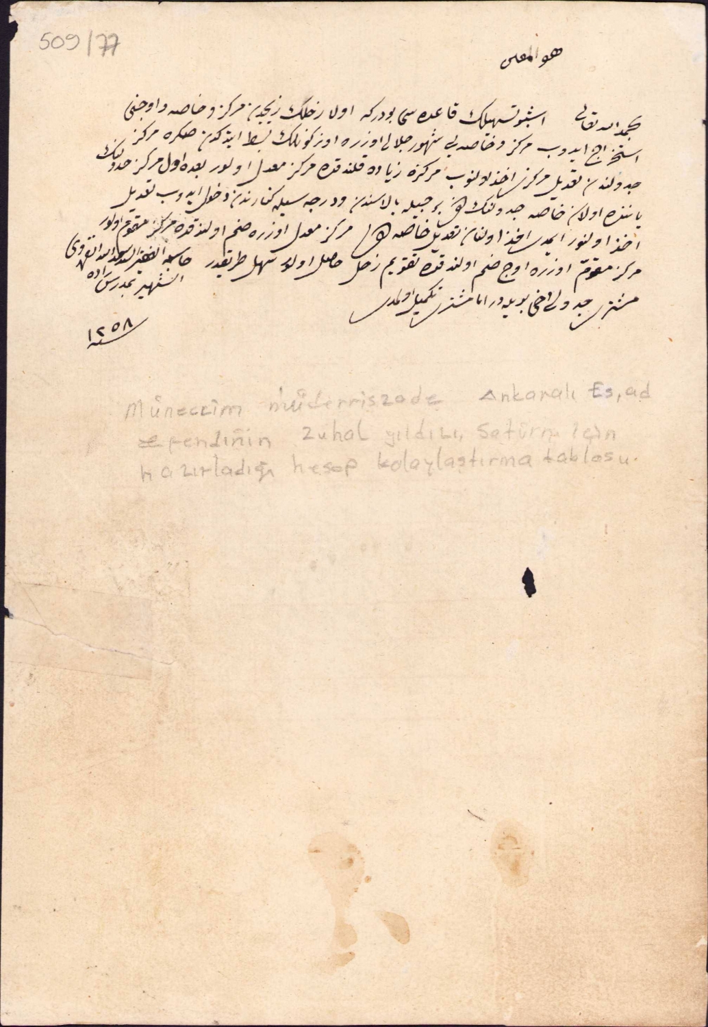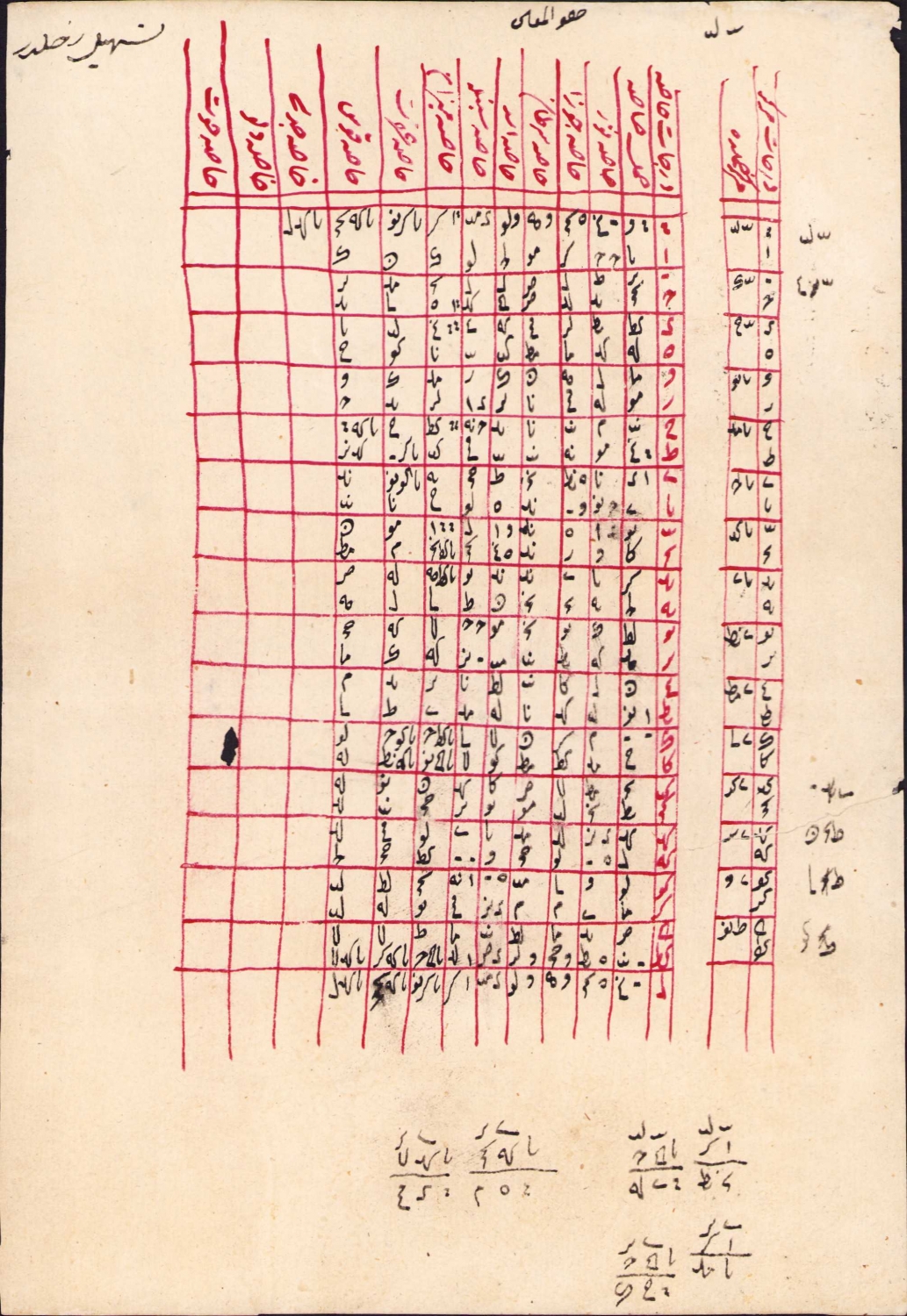 Osmanlıca müneccim müderriszade Ankaralı Esad efendinin zuhal yıldızı, satürn için hazırladığı hesap kolaylaştırma tablosu, 1258, 16x25 cm