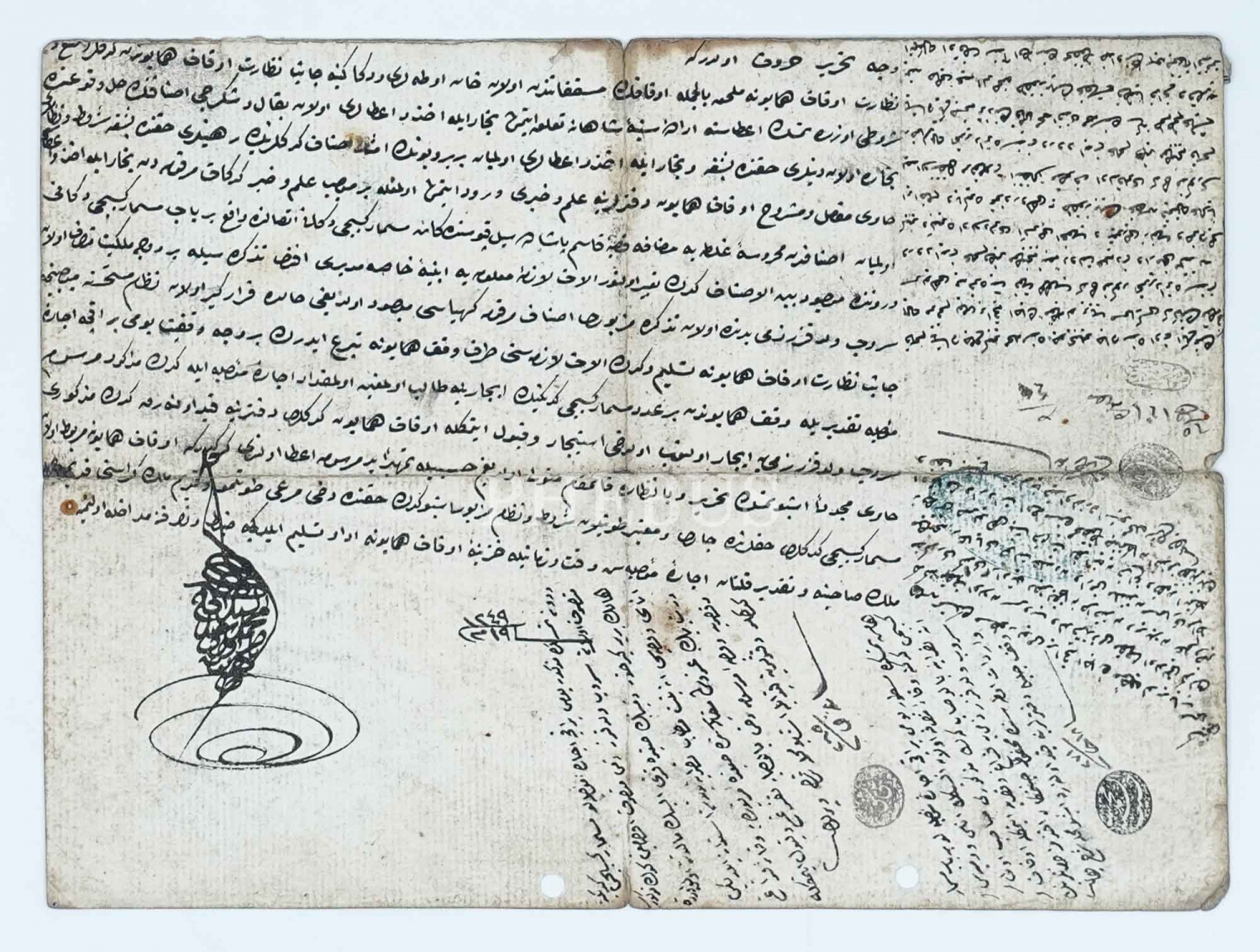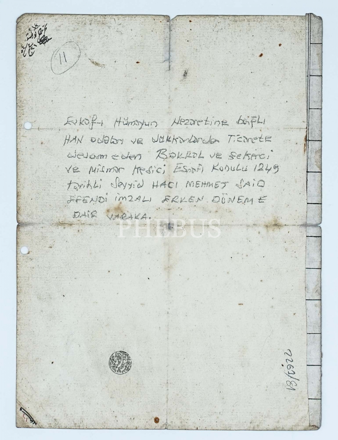 Evkaf-ı Hümayun Nezaretine bağlı han odaları ve dükkanlarda ticarete devam eden bakkal, şekerci esnafının tüccarlara olan borçları ve kiraları ile alakalı 1249 tarihli düzenleme, 27x20 cm...