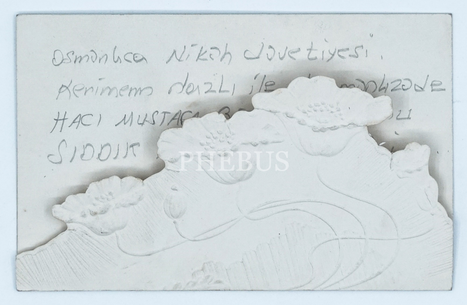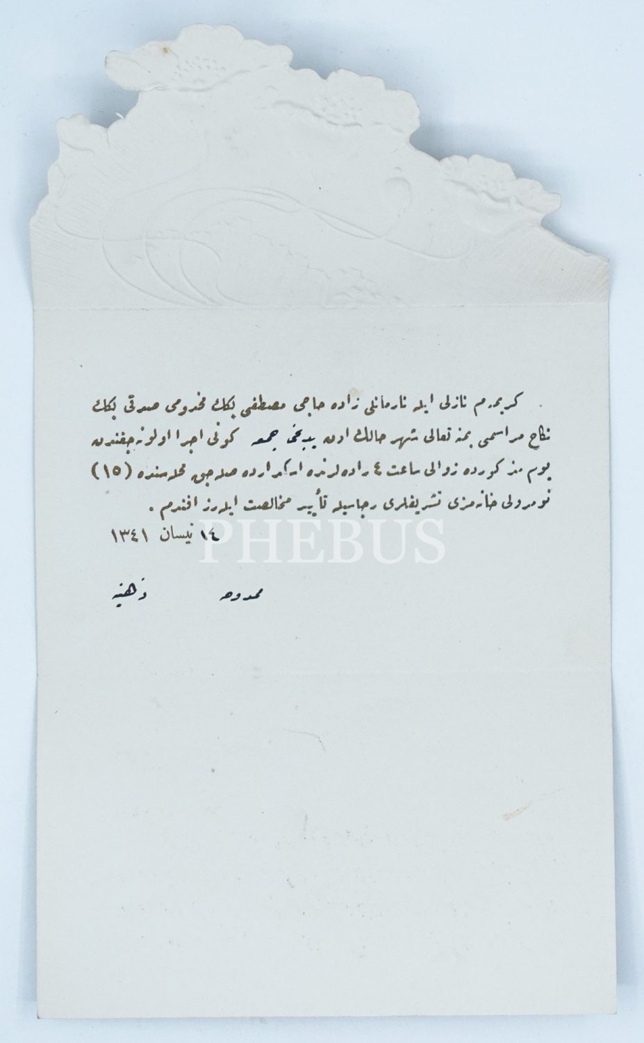 İstiklal Caddesi´nin meşhur yapılarından Narmanlı Han´ın sahibi Narmanlızade Mustafa Efendi´nin oğlu Sıddık Narmanlı´nın düğün davetiyesi, 14 Nisan 1341, 22x13 cm...