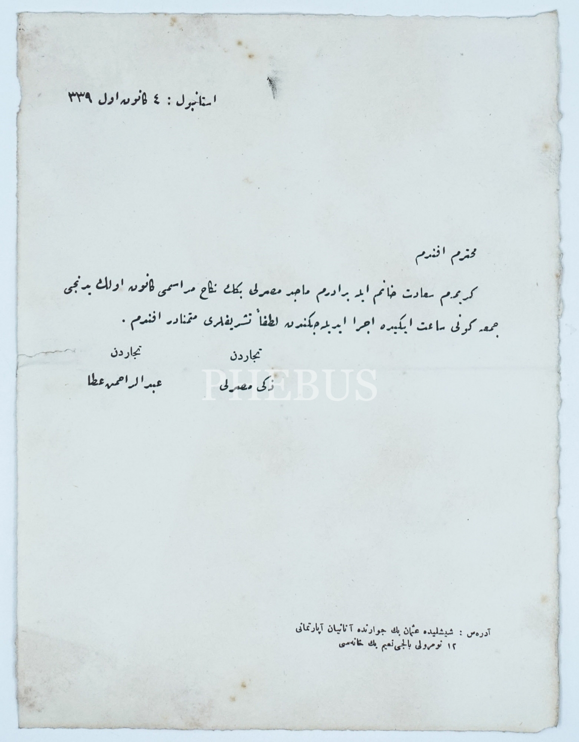 Saadet Hanım ile Macid Mısırlı´nın nikah davetiyesi, 4 Kanunievvel 1339, 15x20 cm...