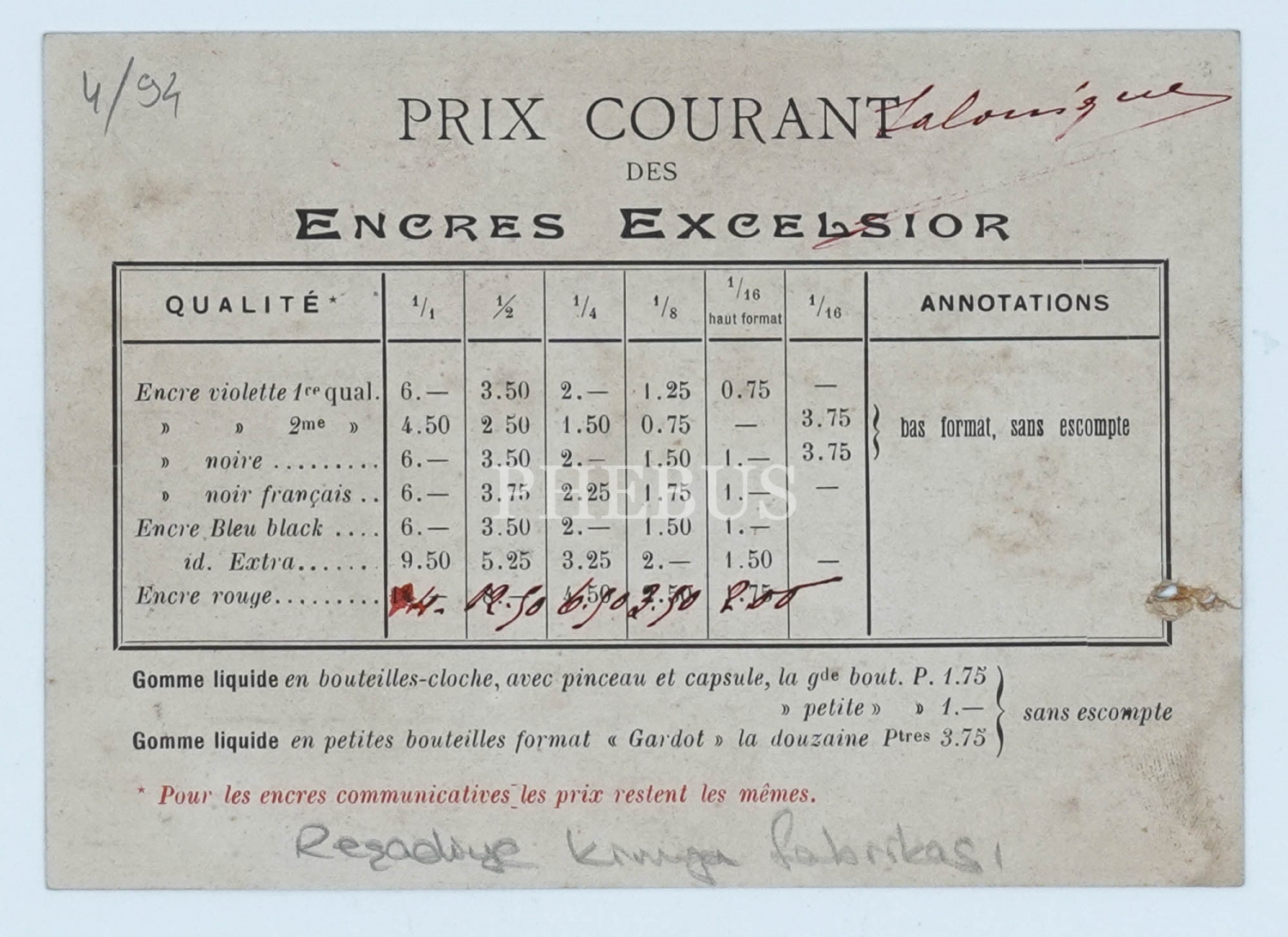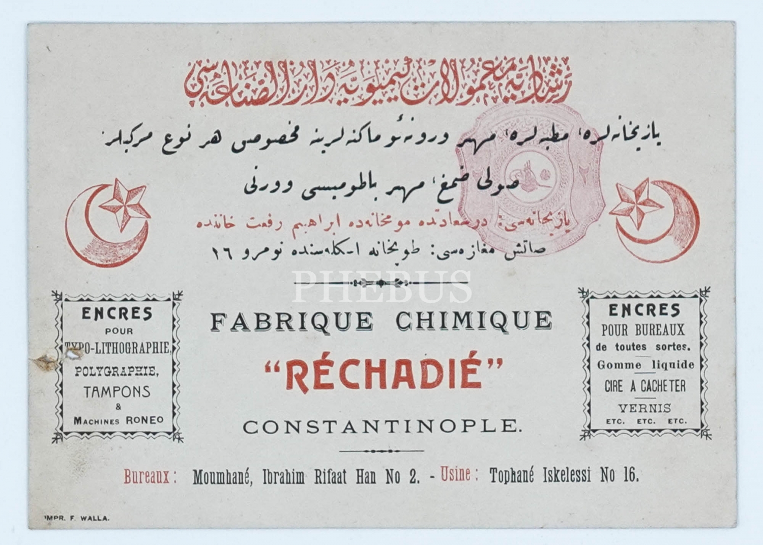Mürekkep ve sulu zamk tüccarı "Reşadiye Ma´mulat-ı Kimyeviye Dar-us Sanaiyyesi" ´nin Osmanlıca ve Fransızca işyeri kartı, 15x11 cm...