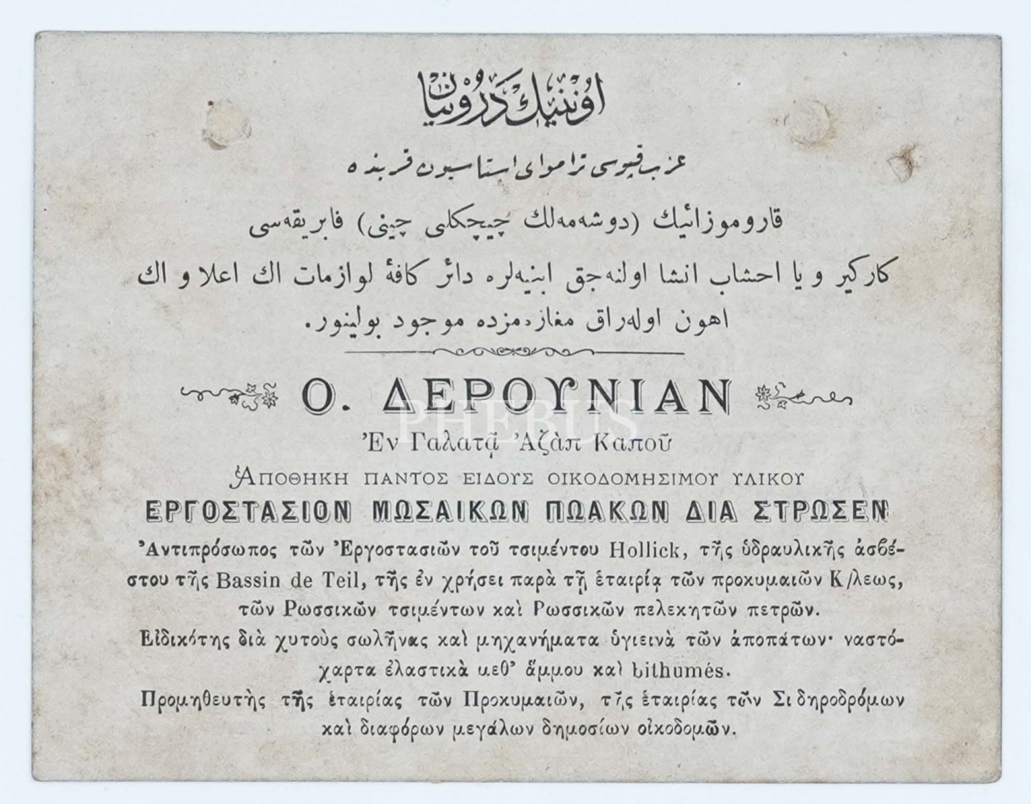 Onnin Deroniyan´ın Osmanlıca, Rumca ve Ermenice işyeri kartı, 13x10 cm...