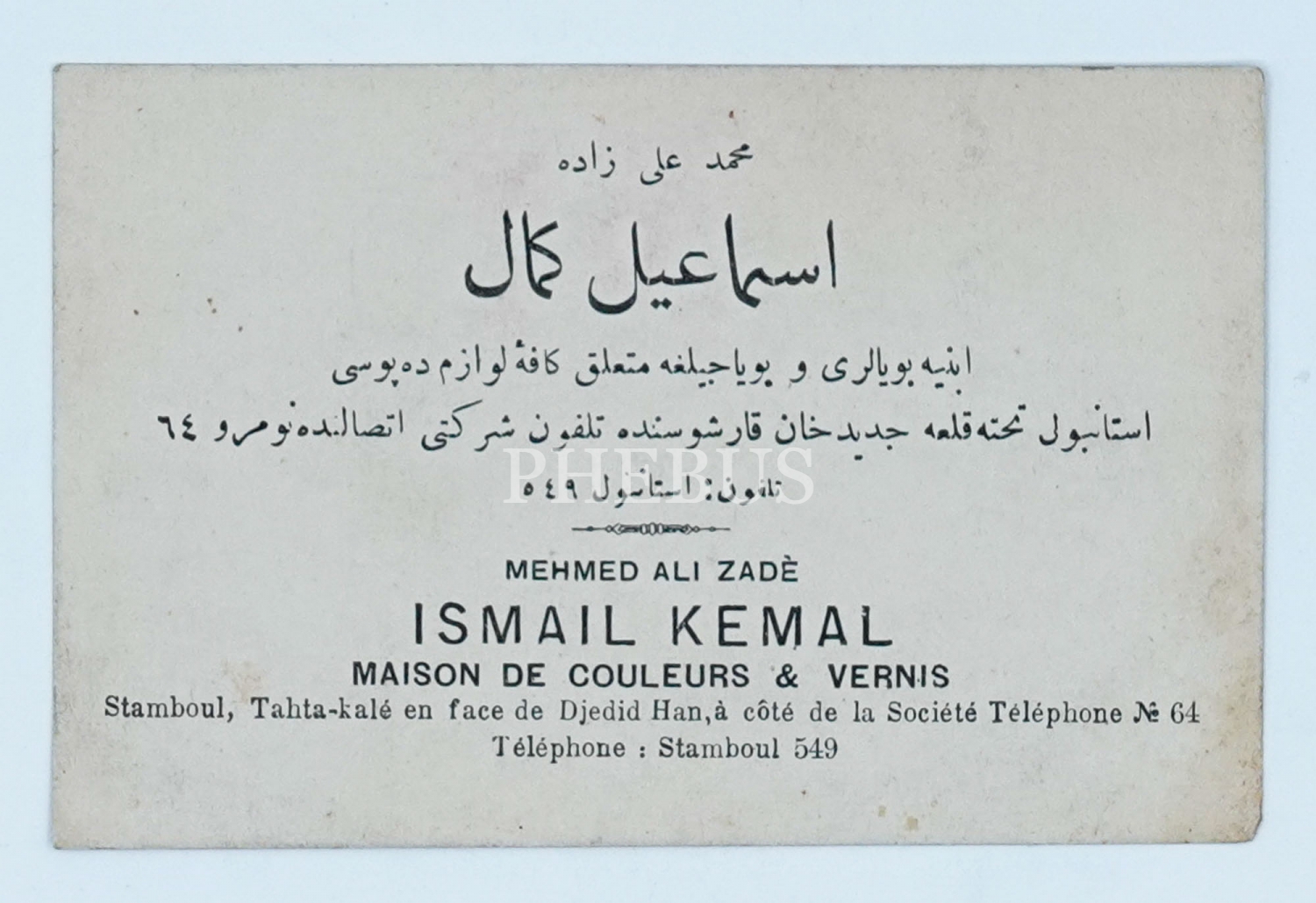 Boya ve boyacılığa dair eşya deposu "Mehmed Alizade İsmail Kemal" ´in Osmanlıca ve Fransızca işyeri kartı, 12x8 cm...