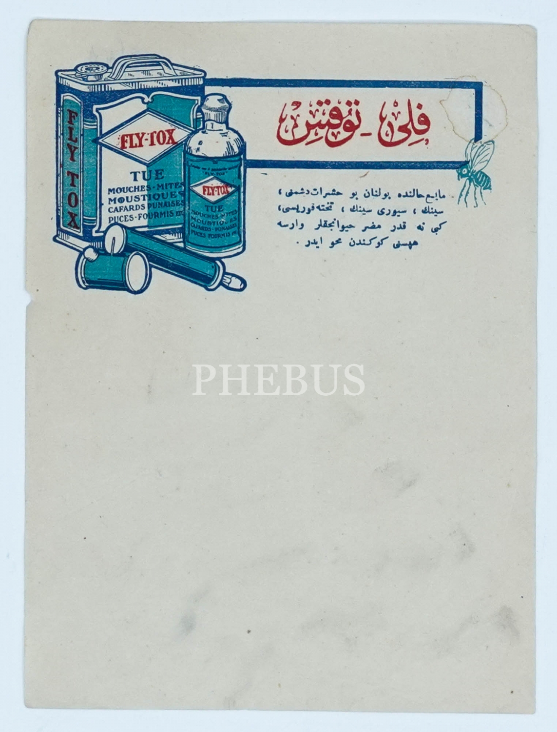 Haşere ilacı "FLY-TOX" ´un reklamlı Osmanlıca reçete kağıdı, 12x16 cm...