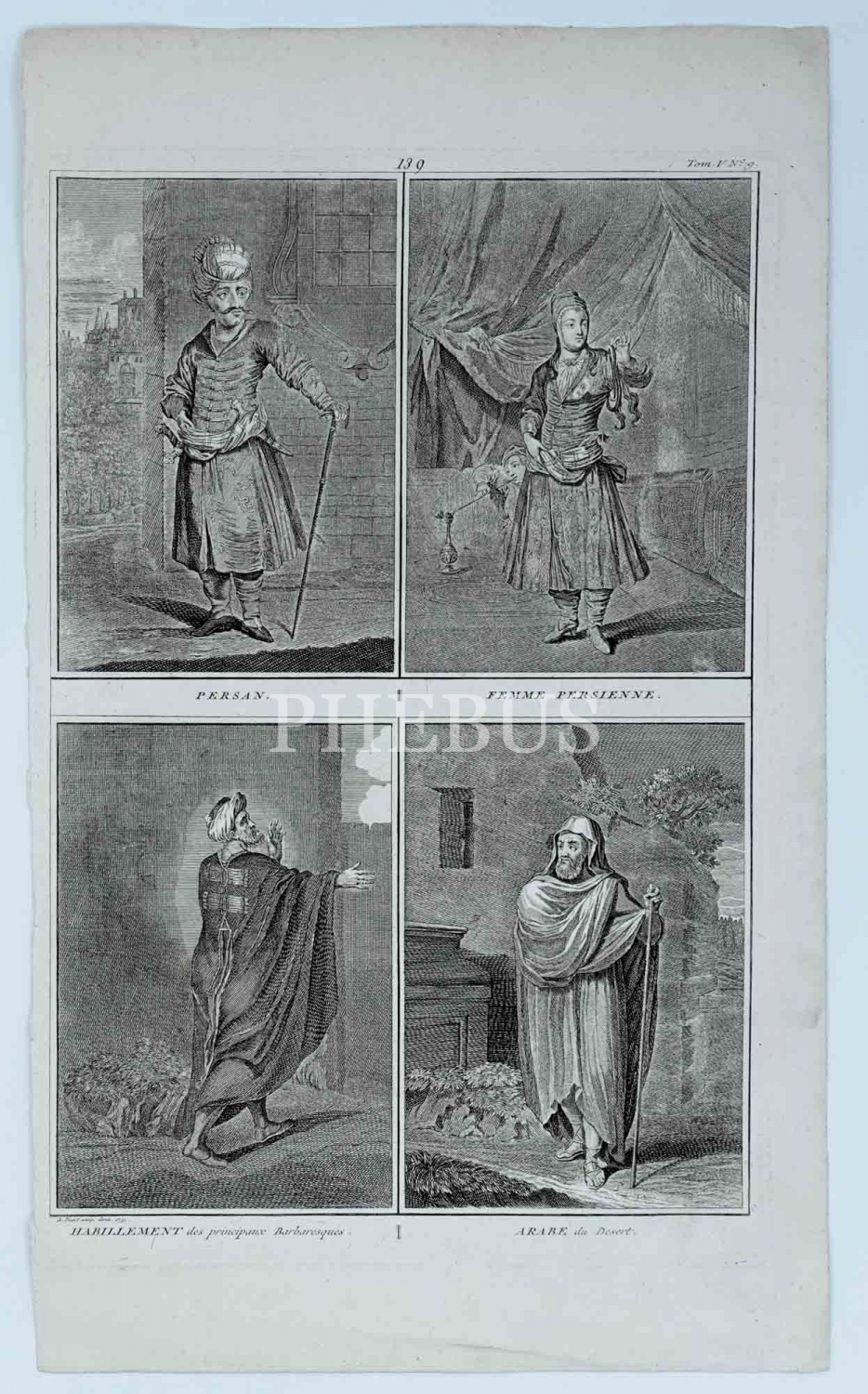 Arap ve Perslerin etnik giyimlerini gösteren gravür, 24x40 cm...