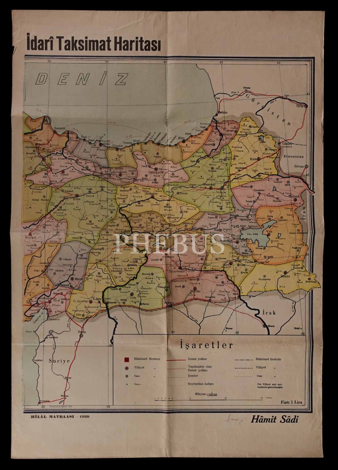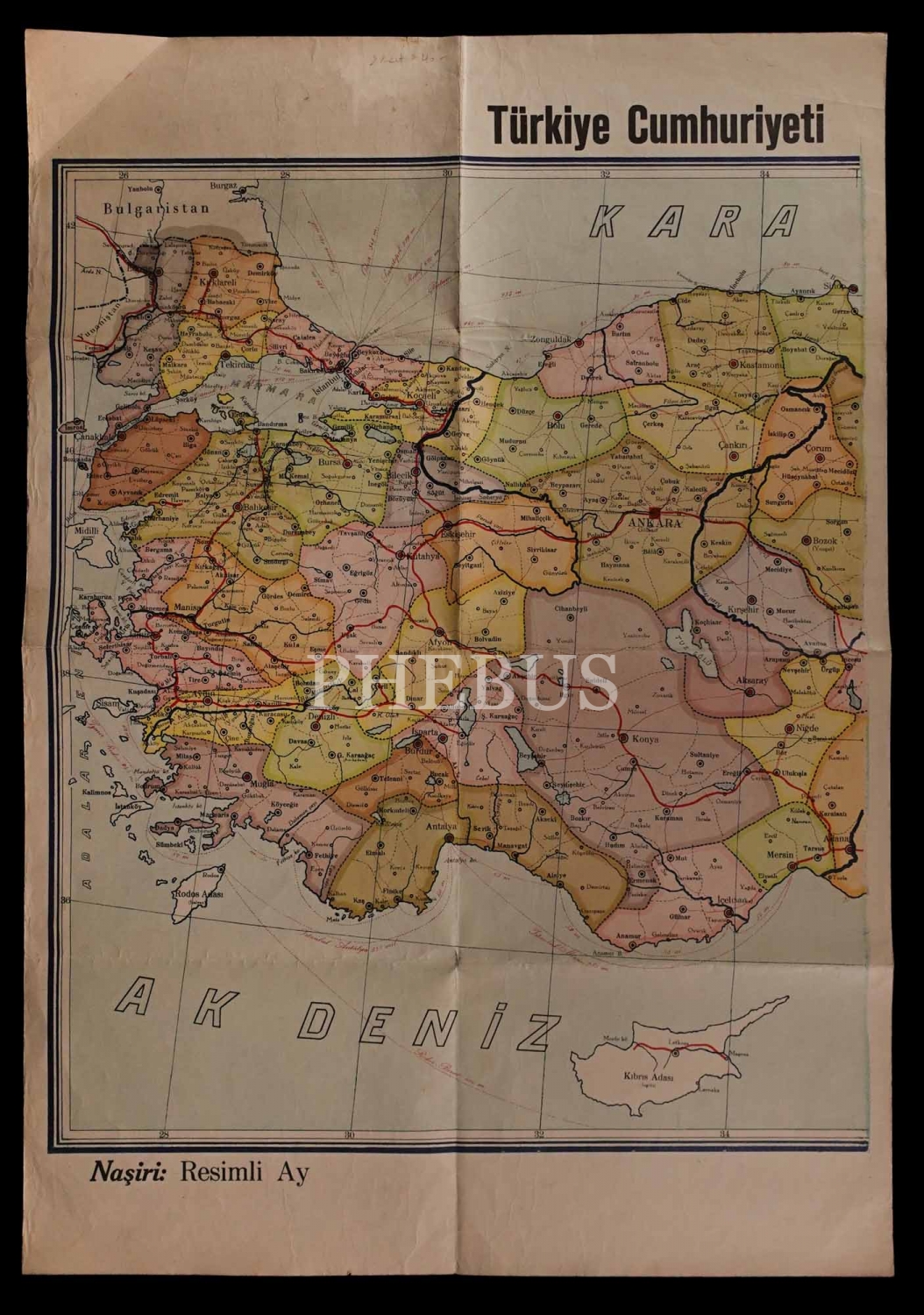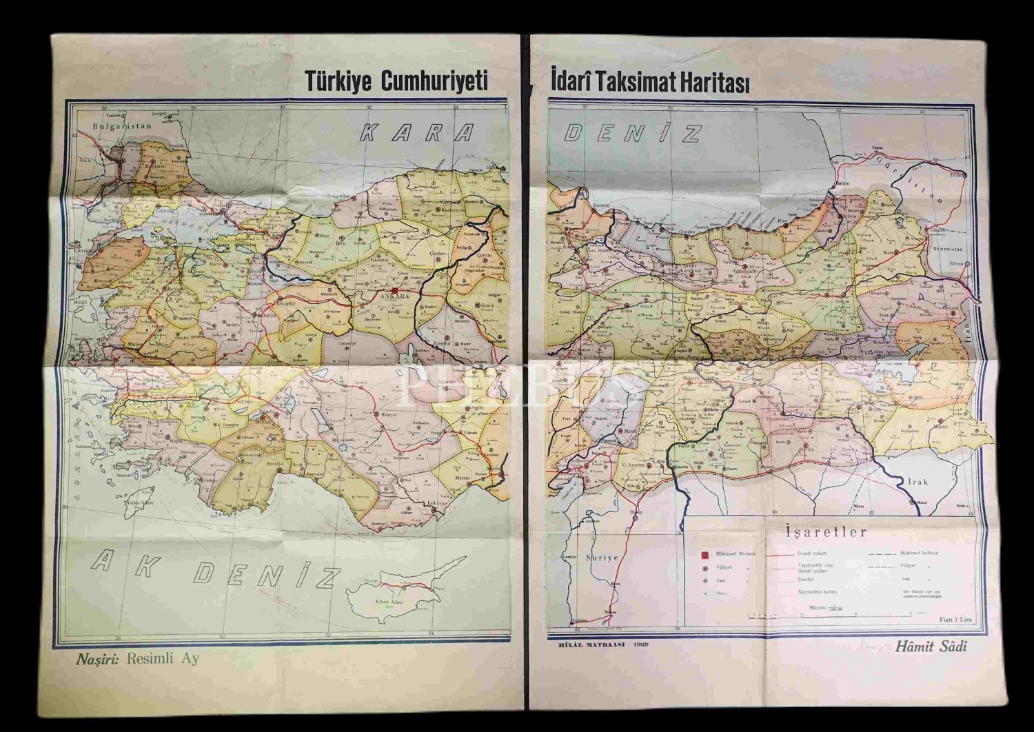 "Türkiye Cumhuriyeti İdarî Taksimat Haritası" başlıklı 2 parça Türkiye Haritası, Hamit Sadi, 1929, Hilal Matbaası, 113x82 cm...