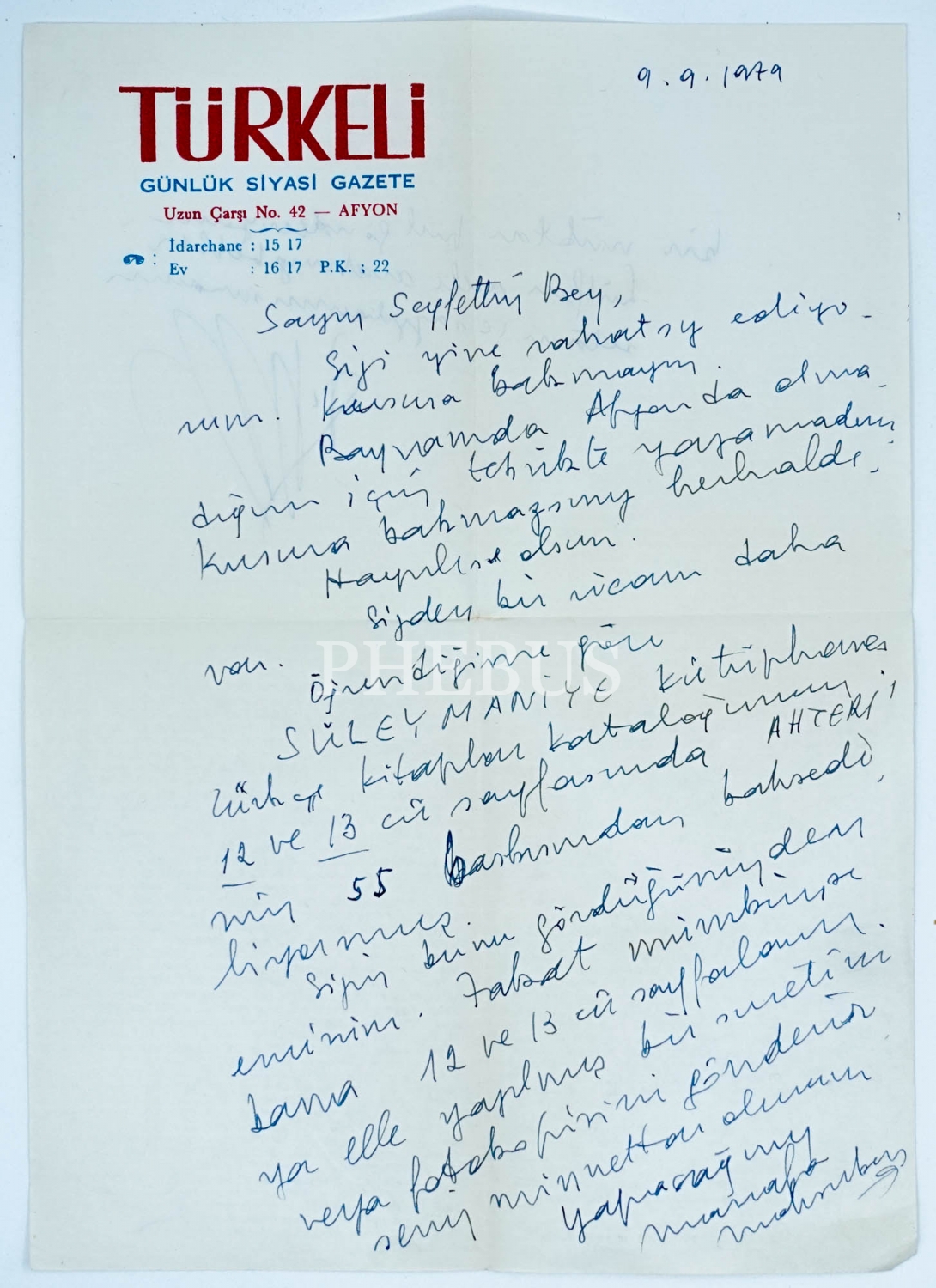 Mektupu gönderen kişi, Seyfettin Özege´nin oluşturduğu katalogda yer alan Ahterî isimli kitabın Süleymaniye Kütüphanesinde bulunan "55 baskısının" bir kopyasını istiyor.