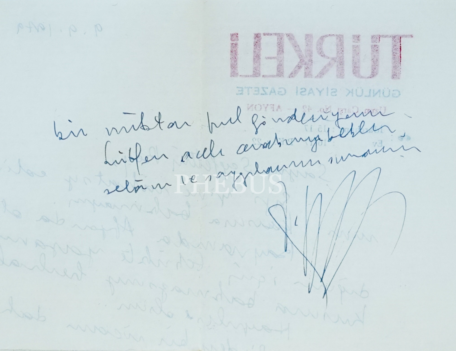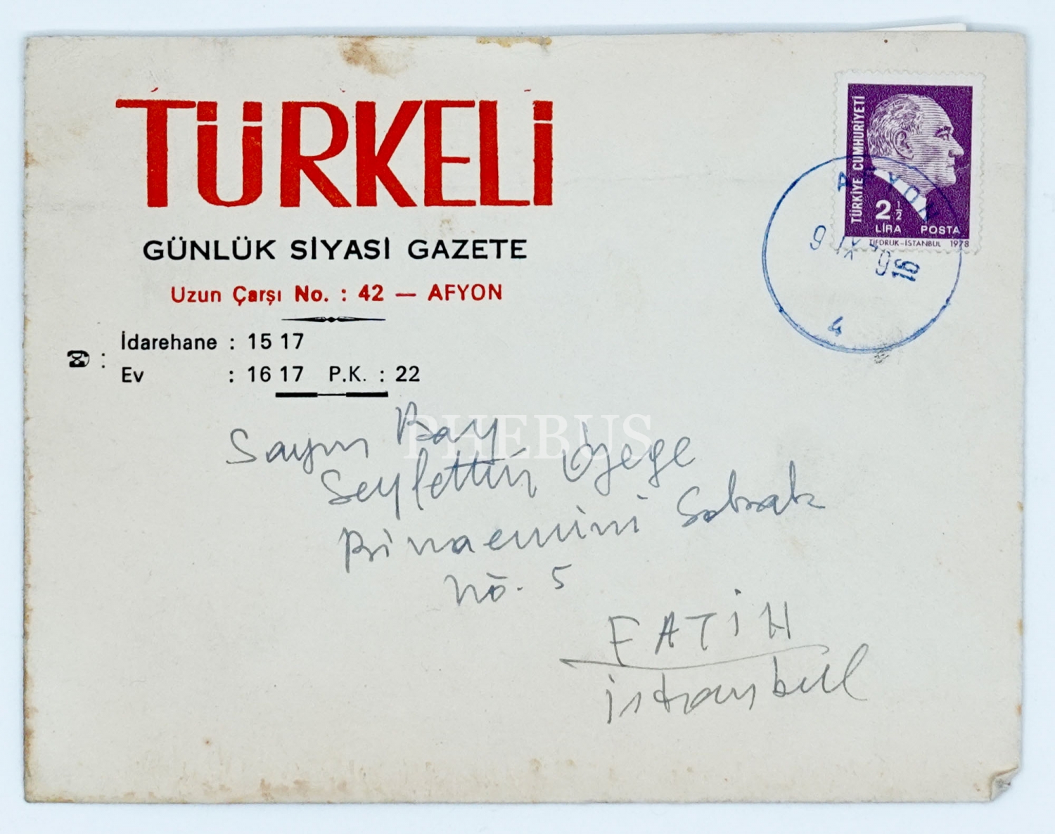 Türkeli Günlük Siyasi Gazete antetli, Seyfettin Özege´ye hitaben kaleme alınmış zarfı içinde mektup, 20x28 cm...