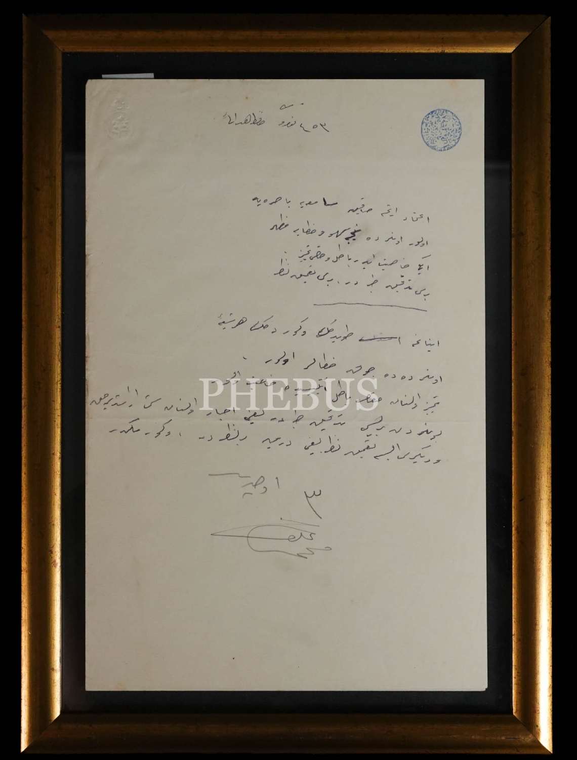 Mehmed Akif Ersoy´un Dârülfünûn Edebiyat Öğretmeniliği görevindeyken değerlendiridiği ve imzaladığı sınav kağıdı, çerçevesinde, 30x42 cm...