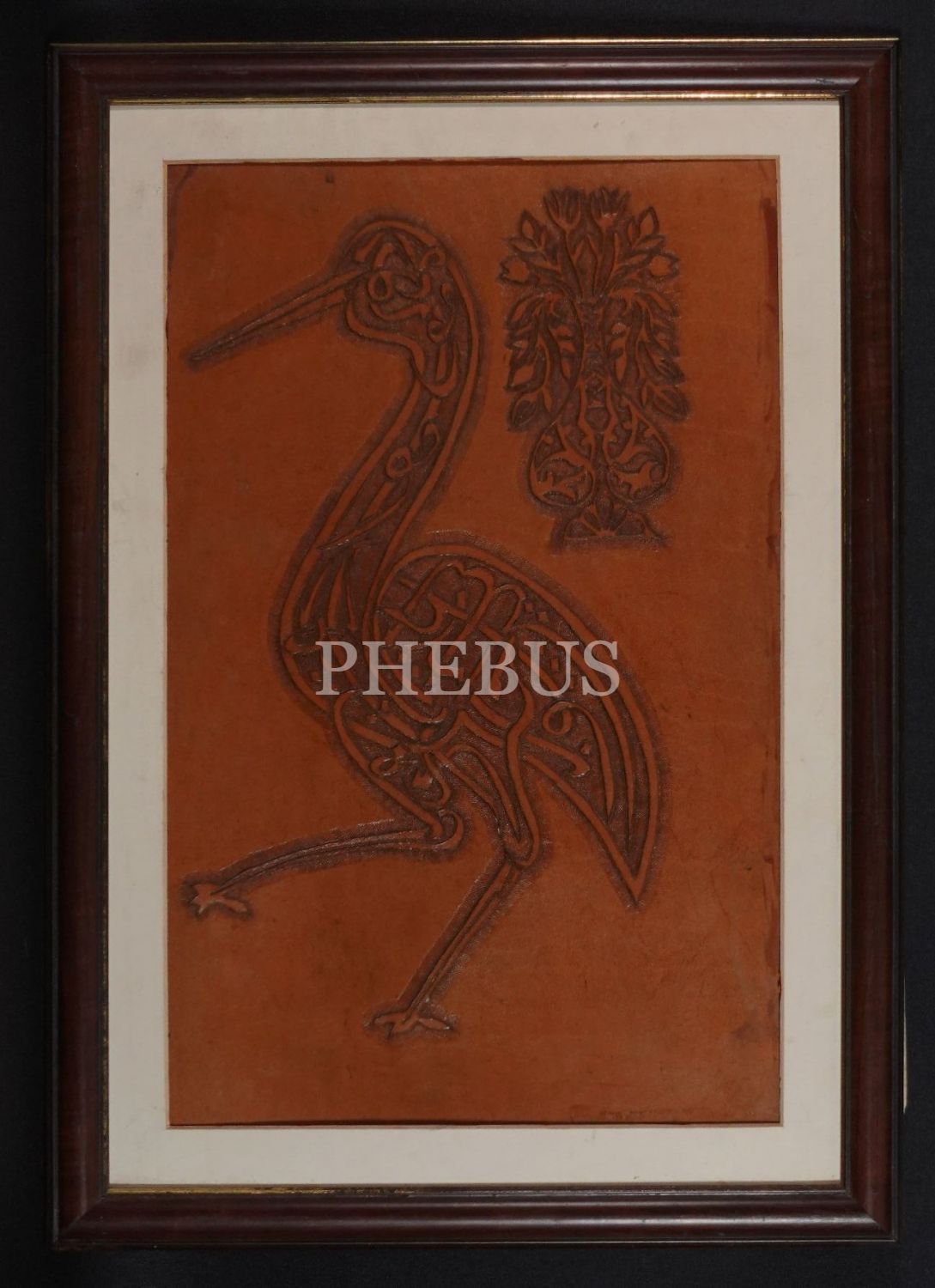 Deri üzerine turna formunda oyma, erken dönem tekke işi sülüs yazı, 41x59 cm...