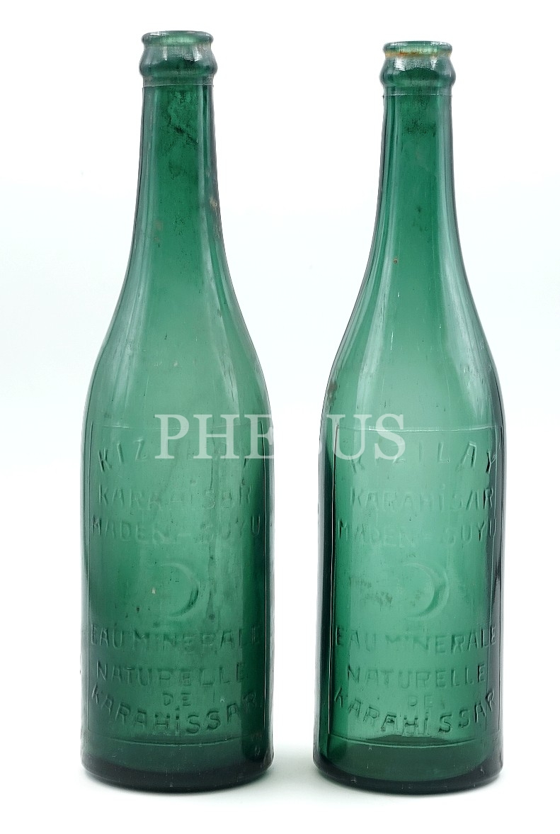 Türkçe ve Fransızca, "Kızılay Karahisar Maden Suyu" kabartma yazılı 2 adet şişe, 28x7 cm...
