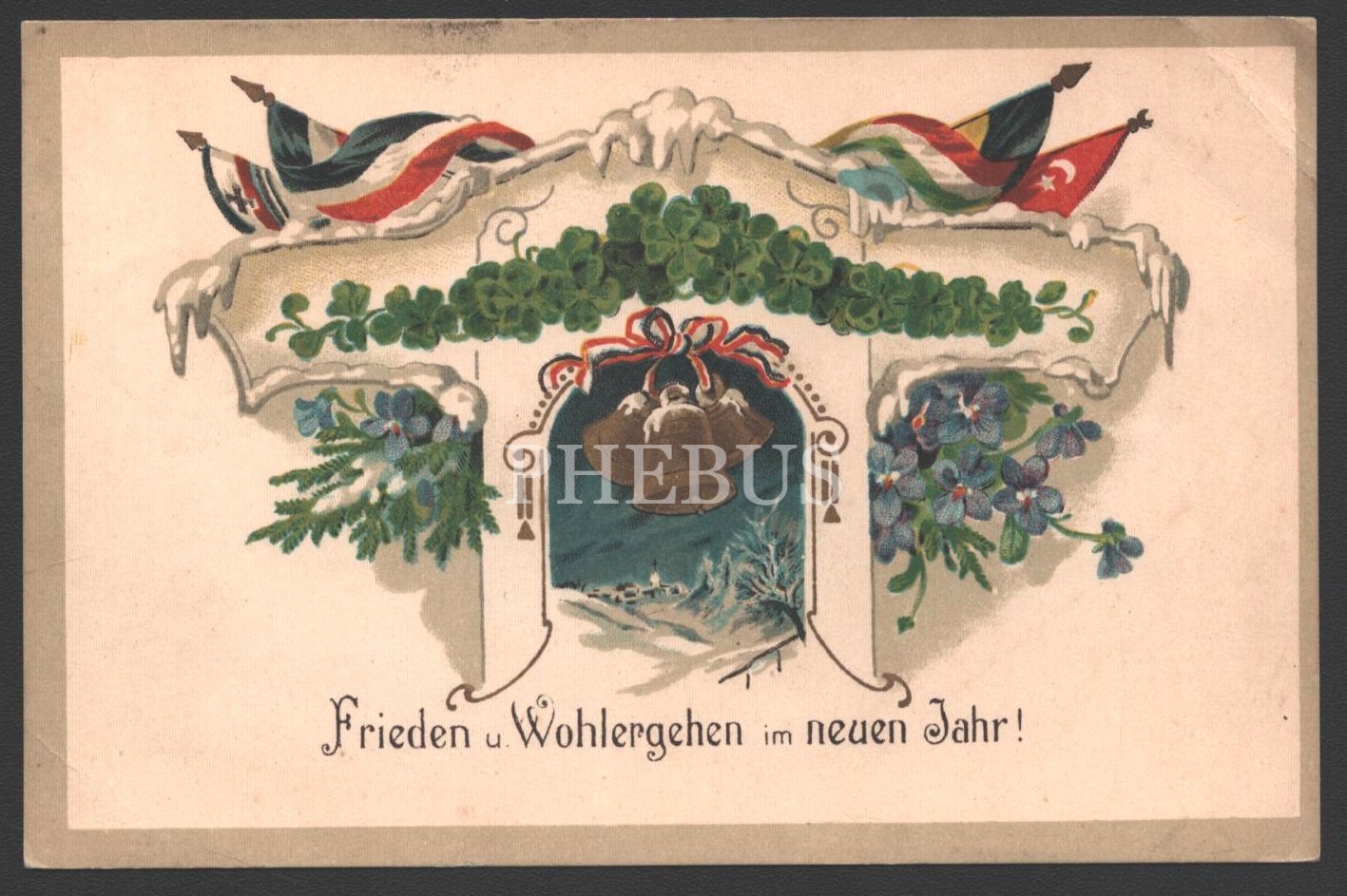 Yeni yıl tebriği temalı Birinci Dünya Savaşı İttifak kartpostalı, "Frieden und Wohlergehen im neuen Jahr", 14x9 cm...