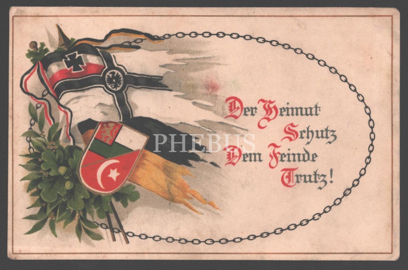 Propaganda yazılı Birinci Dünya Savaşı İttifak kartpostalı, "Der Heimat Schutz Dem Feinde Trutz!", 14x9 cm...