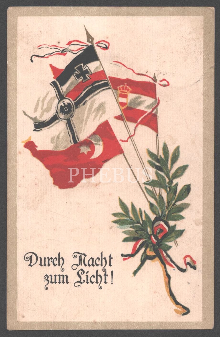 Propaganda yazılı Birinci Dünya Savaşı İttifak kartpostalı, "Durch nacht zum licht!", 14x9 cm...