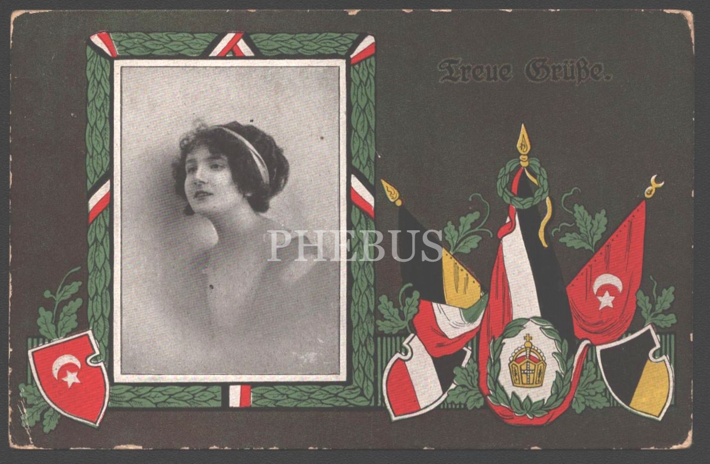 Birinci Dünya Savaşı İttifak kartpostalı, "Treue Grüse", 14x9 cm...