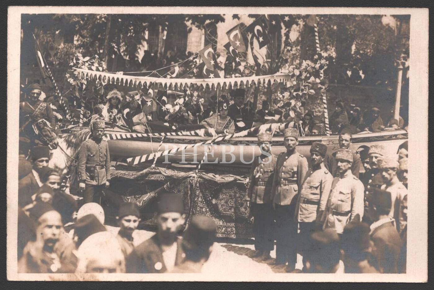 Osmanlı döneminden, bir bayram kutlaması için bir araya gelmiş askerler, çocuklar ve sivillerin fotoğrafı, 14x9 cm...