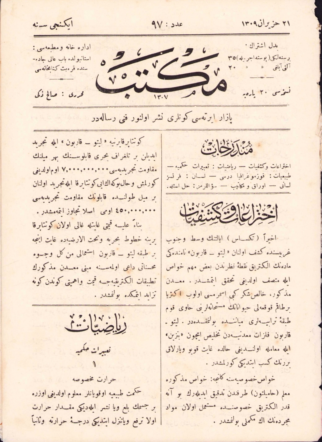 Osmanlıca Mektep risalesi, 1309, muharriri Salih Zeki, 10 sayfa, 14x20 cm