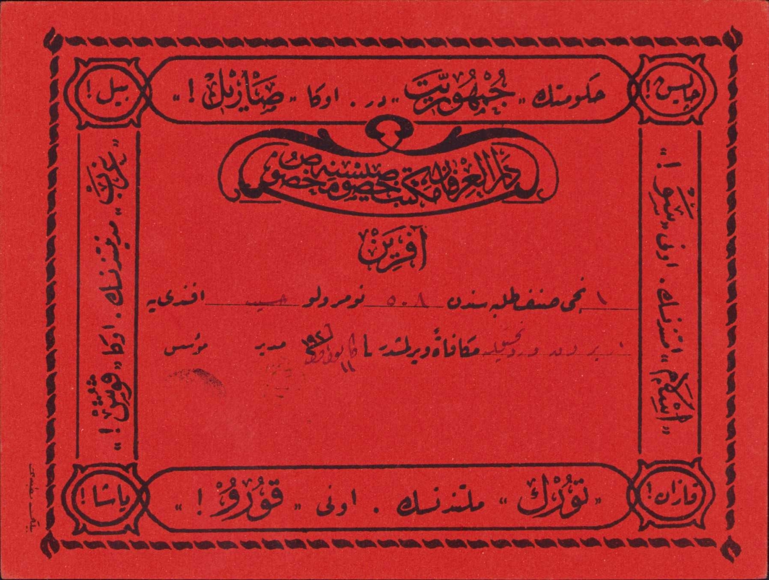 Osmanlıca Aferin, Darülirfan Mektebine Mahsus Hükümet "Cumhuriyet" "Türk" sloganları ile çevrili, 1926,15x11 cm