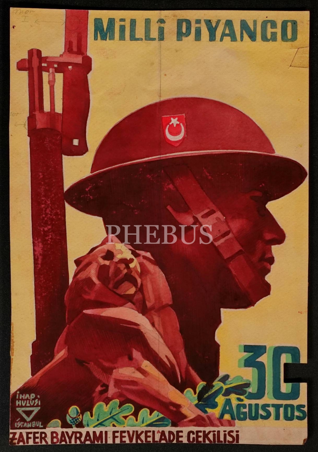 İhap Hulusi´den imzalı orijinal Millî Piyango afişi çizimi, "Millî Piyango 30 Ağustos Zafer Bayramı Fevkelâde Çekilişi", 24x34 cm...