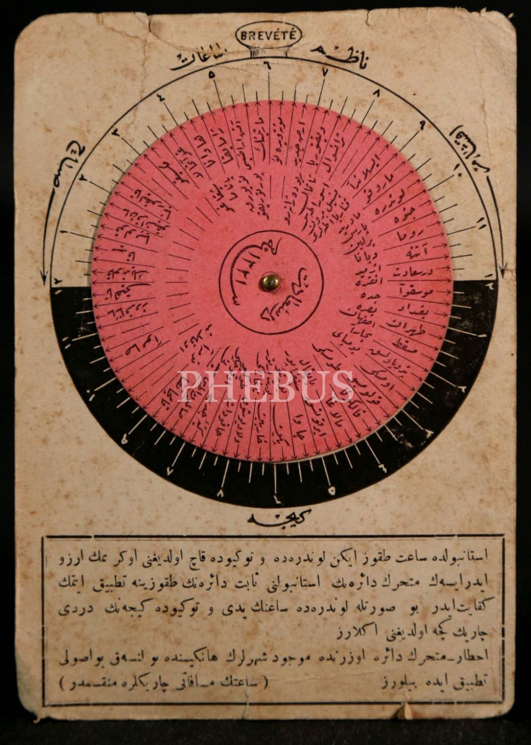 Dünyanın dört bir yanında bulunan şehirlerin saatlerini öğrenmek için tasarlanmış 1321 tarihli Osmanlıca kartpostal, (tab´ı ve naşiri: Sofokli Nikolaki Bey)11x15 cm...