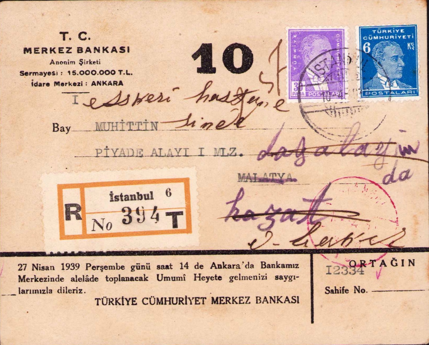 T. C. Merkez Bankası formüler kart, 1939, postadan geçmiş, 13x11 cm