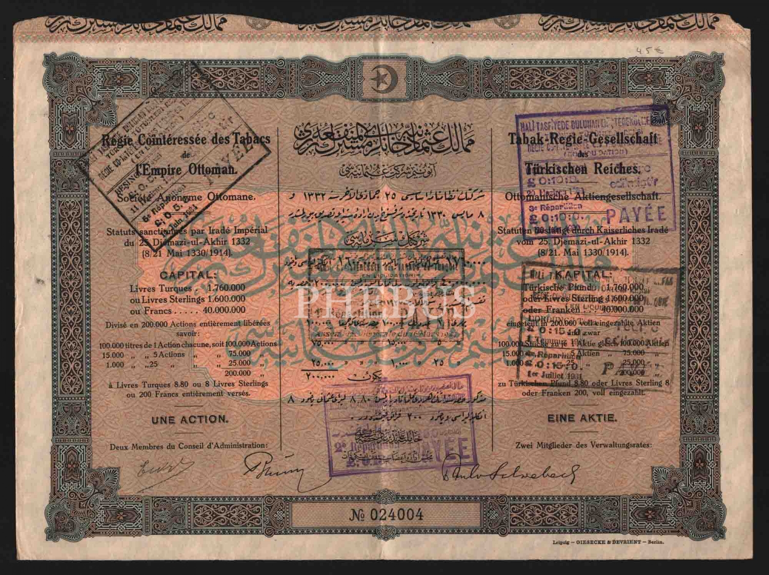 Memali̇k-i̇ Osmani̇ye Dühanlari Müşterek Ül-menfaa Reji̇ Anoni̇m Şi̇rketi̇ Osmani̇yesi̇ (Osmanlı Tütün/Sigara Şirketi)´nin Osmanlıca, Fransızca ve Almanca 1 Aksiyon Hisse senedi, 35x26 cm...