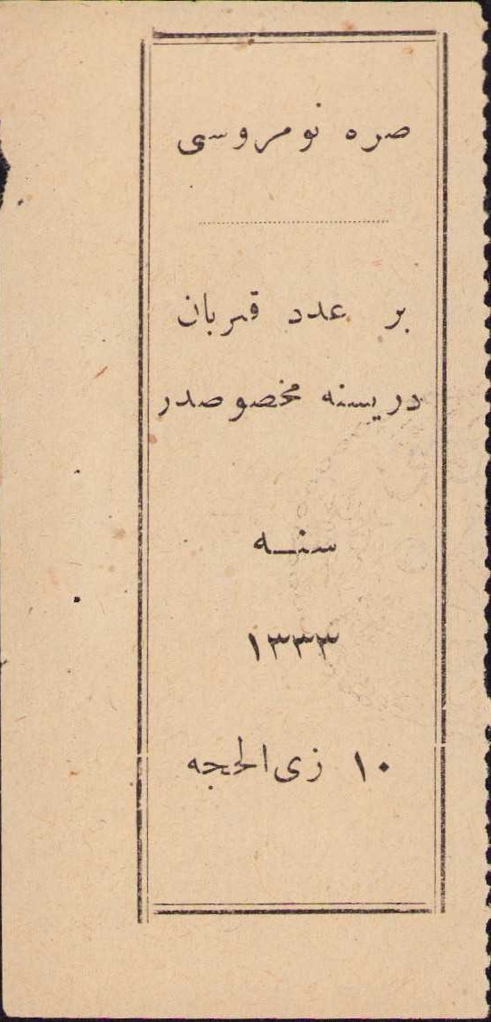 Osmanlıca 1333 tarihli bir adet kurban derisine mahsus sıra numarası fişi, 4x9 cm