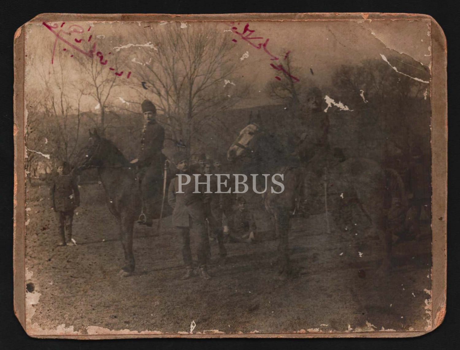 At üzerinde poz veren Edirneli İbrahim Efendi, Sivaslı Süheyl Efendi ve Osmanlı askerlerinin hatıra fotoğrafı, 16x12 cm...