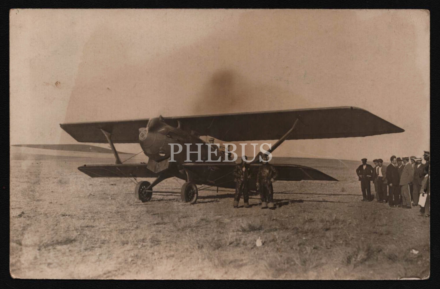 Teyyare önünde poz veren pilotlar ve onları izlemeye gelen heyetin hatıra fotoğrafı, 14x9 cm...