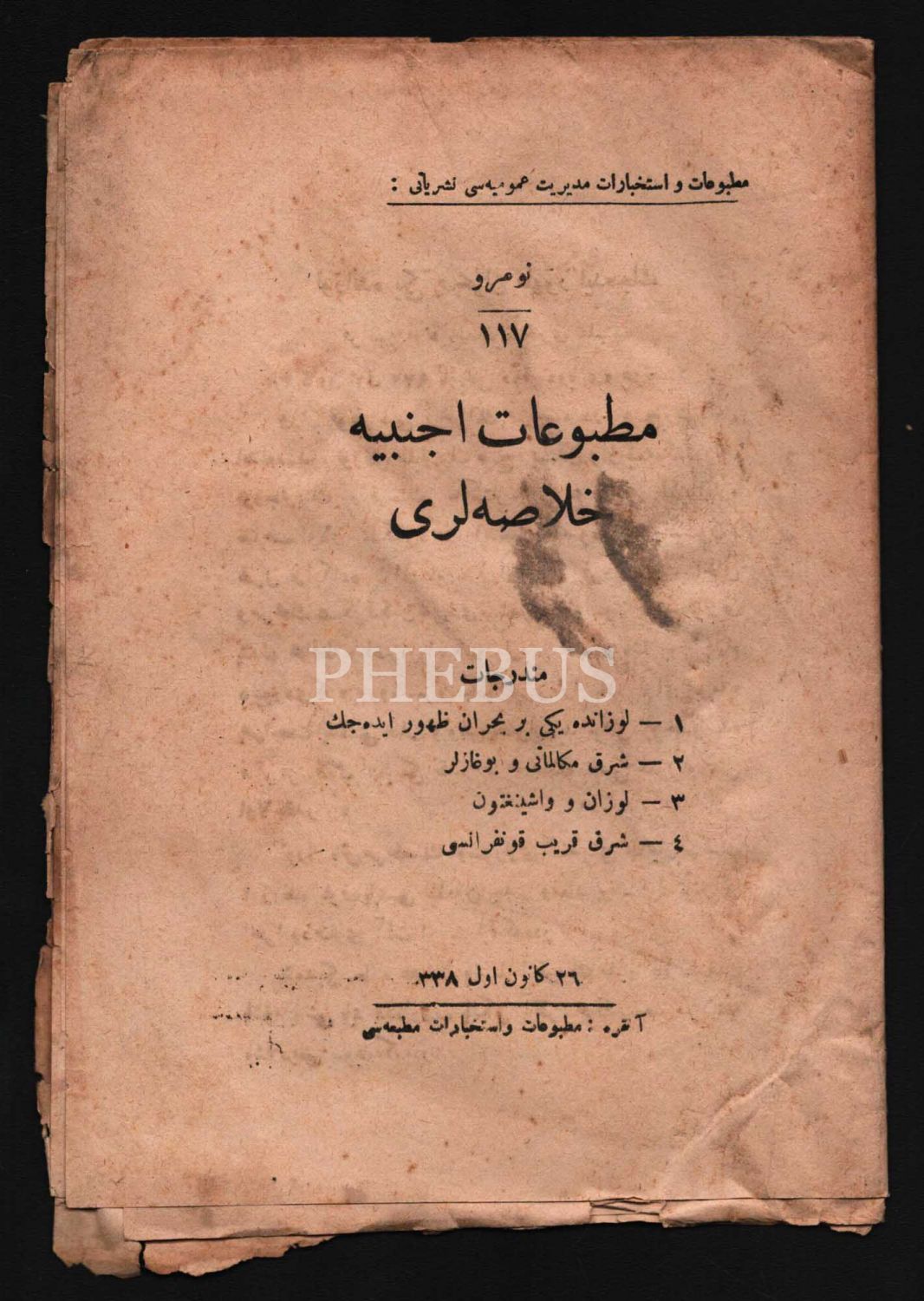 MATBUAT-I ECNEBİYYE HÜLASALARI´nın 22 Kanunievvel 1338 tarihli 117. sayısı, Matbuaat ve İsthbarat Matbaası, 24 sayfa, 14x20 cm...