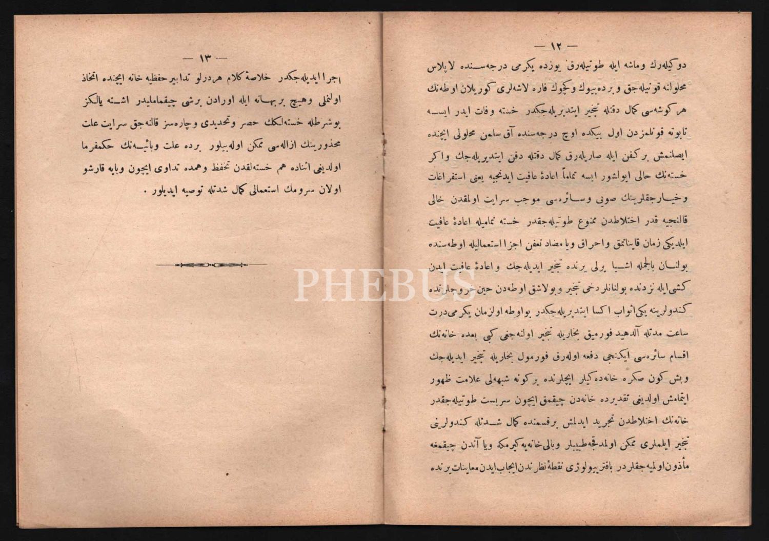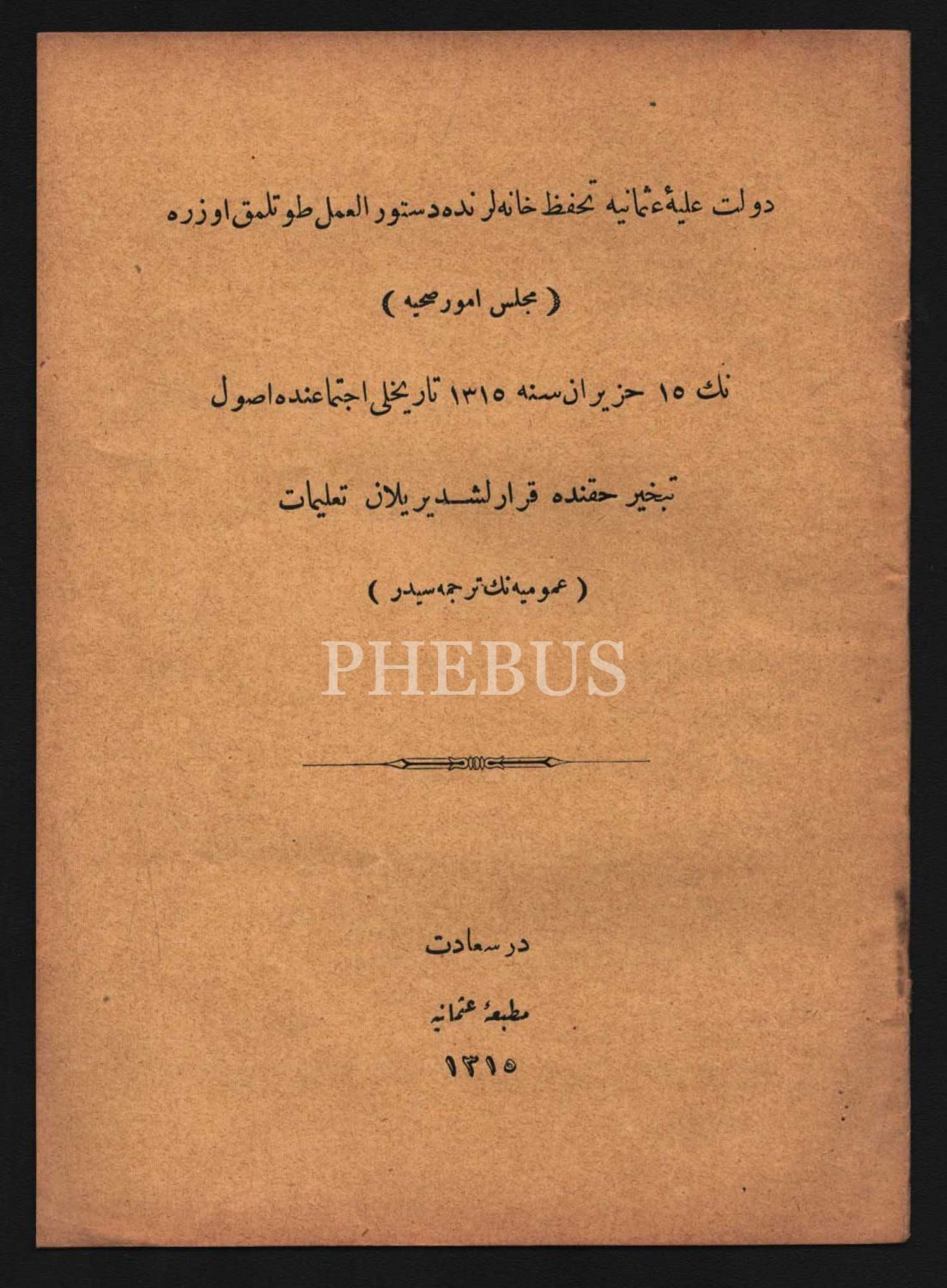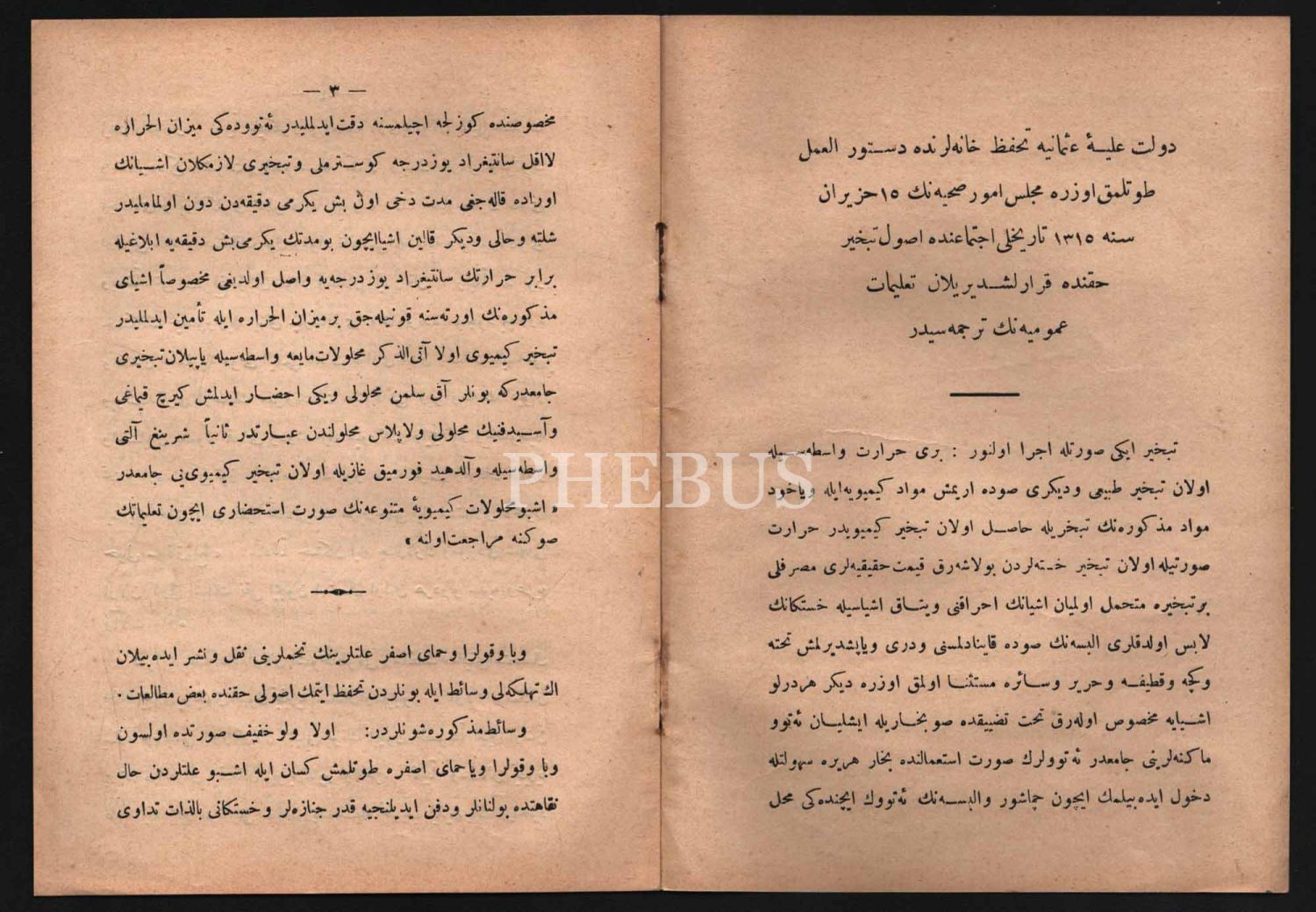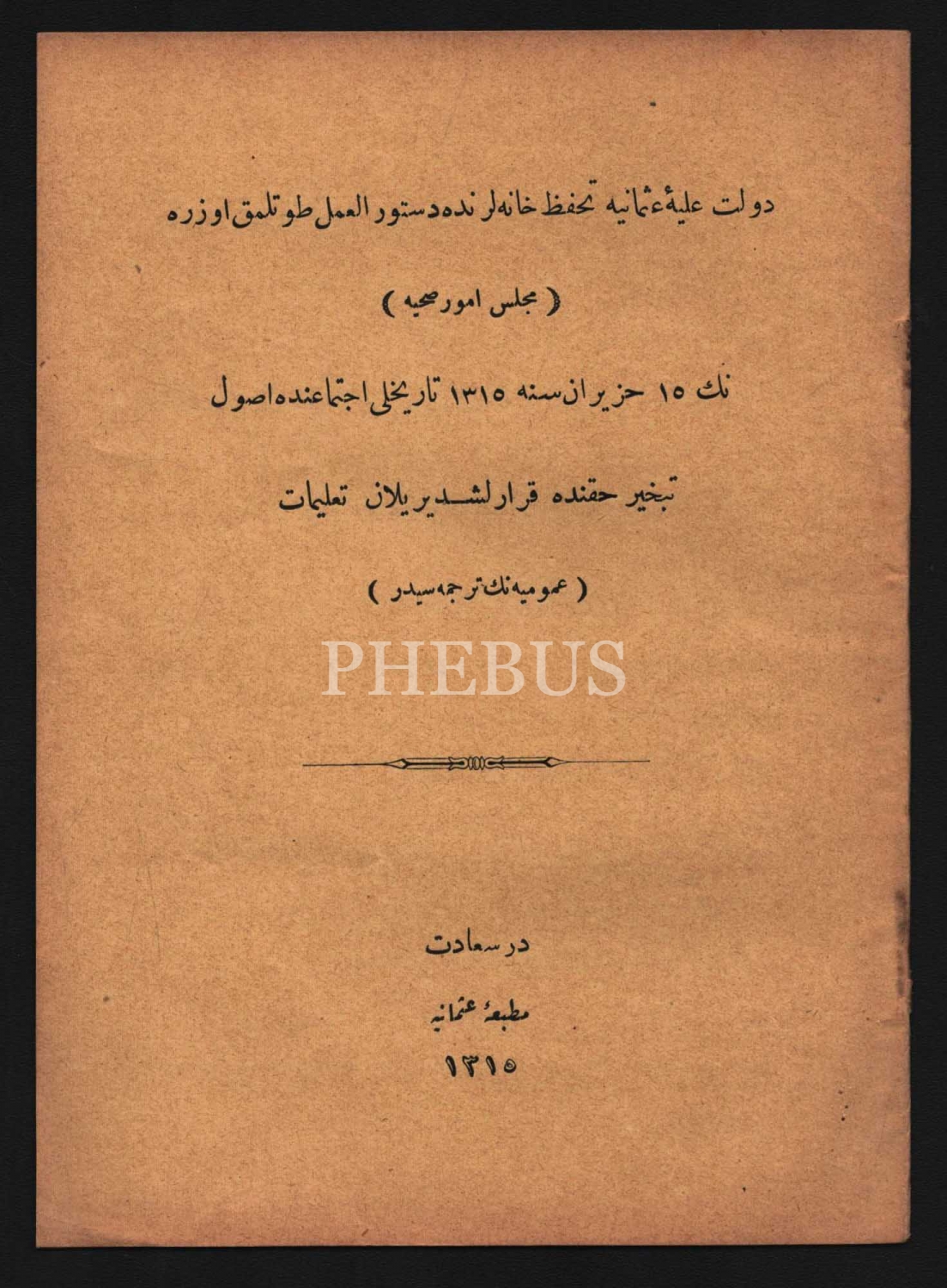 Meclis-i Tehaffuz (Karantina Meclisi) tarafından 15 Haziran 1315 tarihinde gerçekleştirilen oturumda Kolera ve Veba´dan korunmak için temizlik yöntemi olarak kullanılan tebhirin (buharlaştırma) talimatnamesi, 1315, Matbaa-i Amire, 13 sayfa, 14x19 cm...