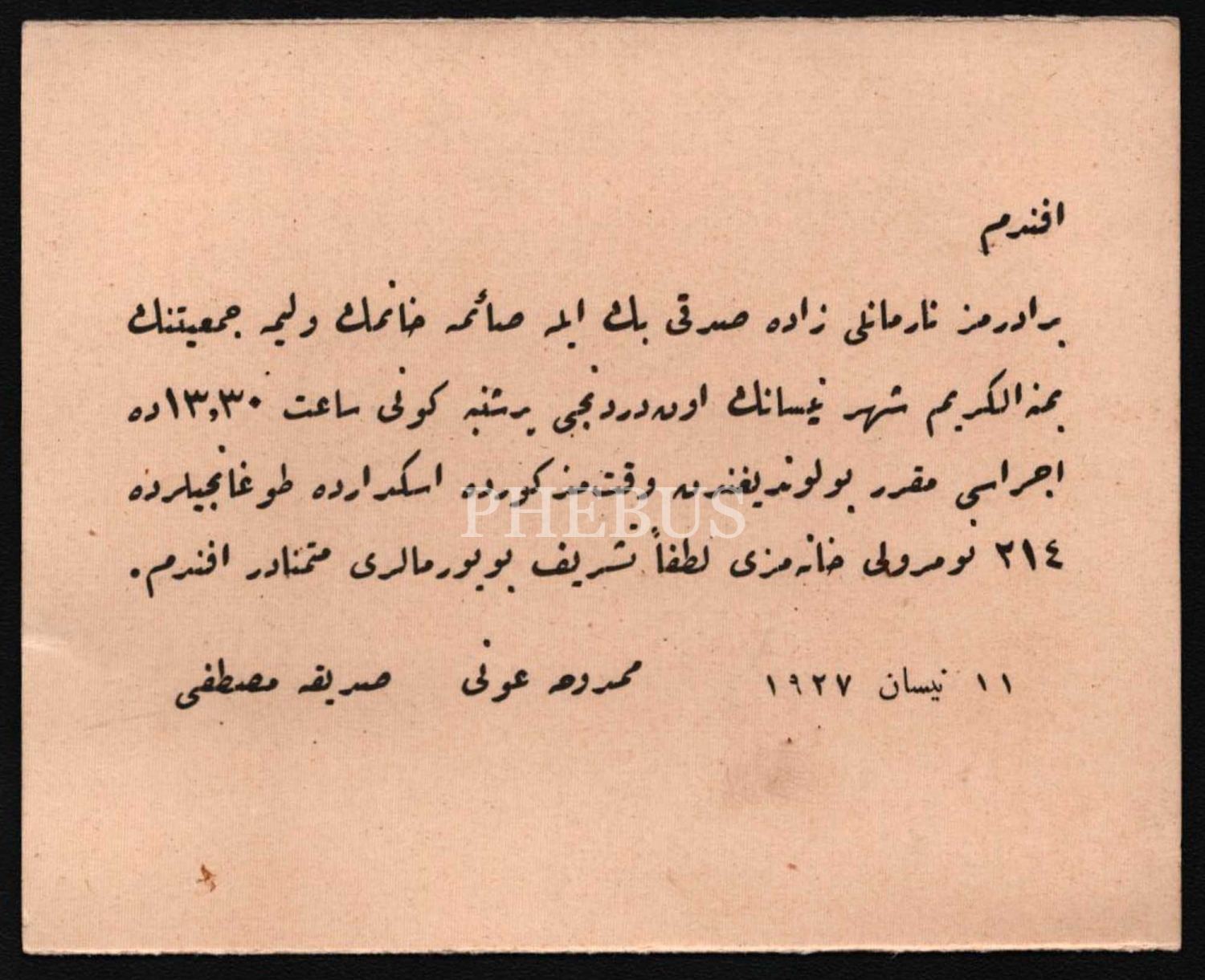 İstiklal Caddesi´nin meşhur yapılarından Narmanlı Han´ın sahibi Narmanlızade Mustafa Efendi´nin oğlu Sıddık Narmanlı´nın düğün davetiyesi, 14 Nisan 1341, 22x13 cm...