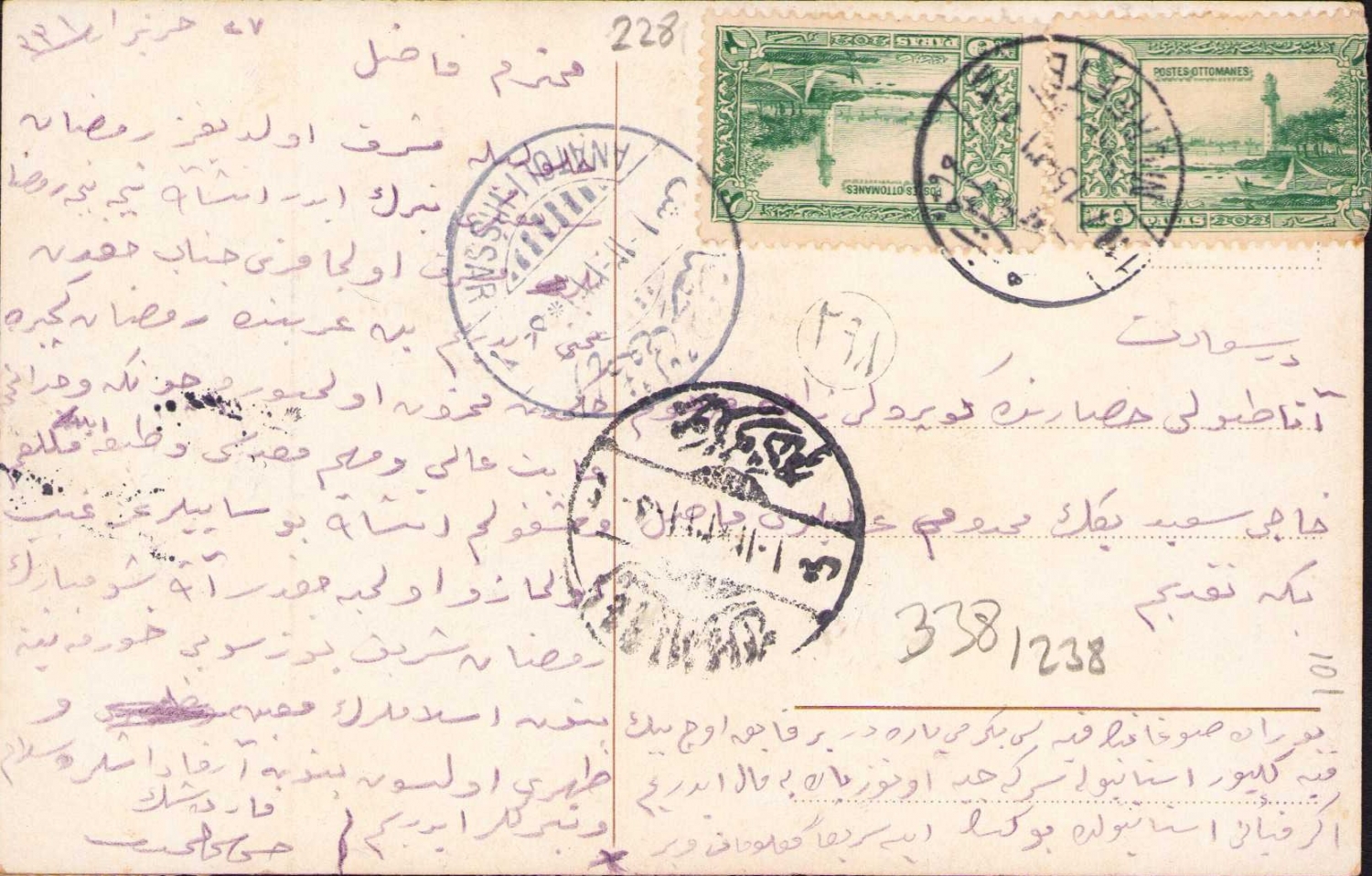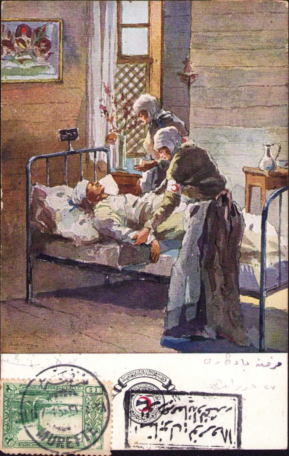 Osmanlı Hilal-i Ahmer serisinin yaralı askerler kartpostalı, postadan geçmiş önden pullu, 1333 tarihli