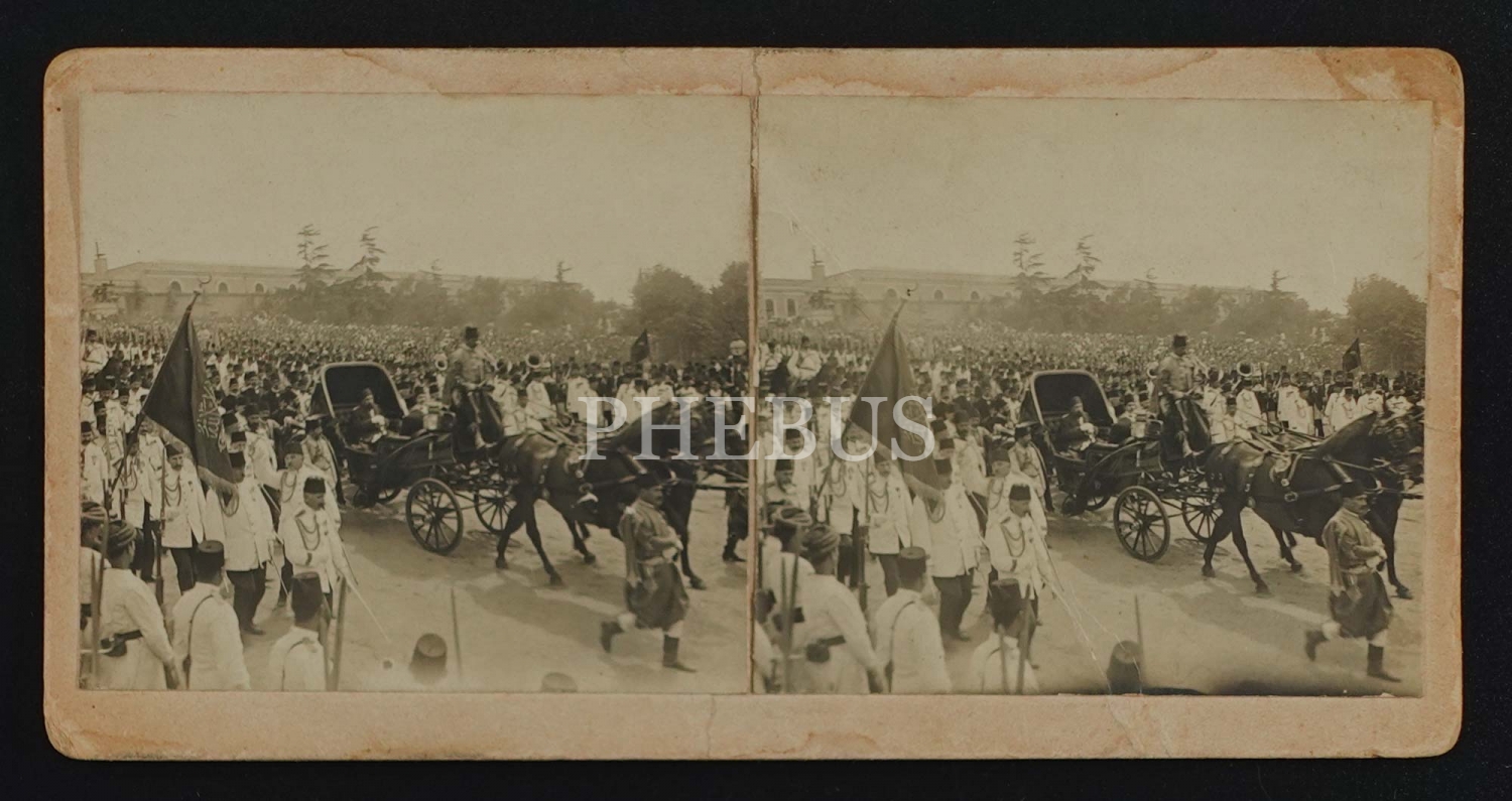 Sultan İkinci Abdülhamid'i Cuma selamlığında gösteren stereoview kart, 18x9 cm...