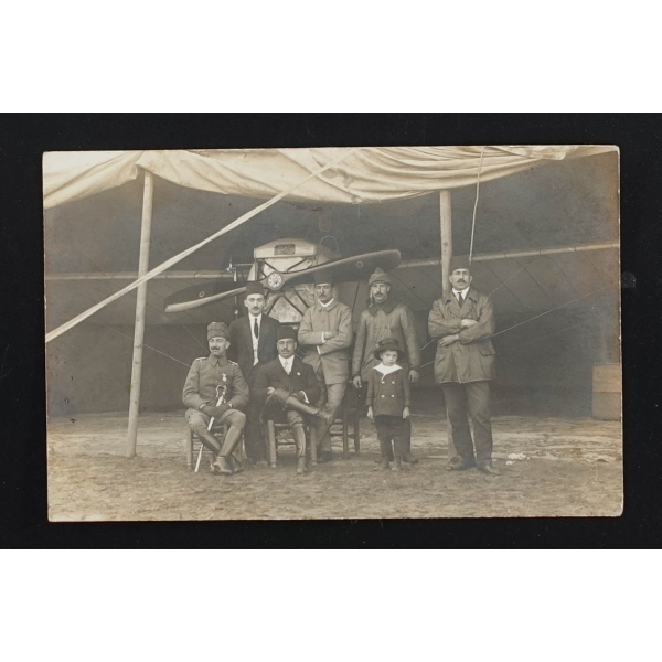 Osmanlıca "Edremit" yazılı tayyare önünde hatıra fotoğrafı çektiren askeri ve sivil erkan, 14x9 cm...