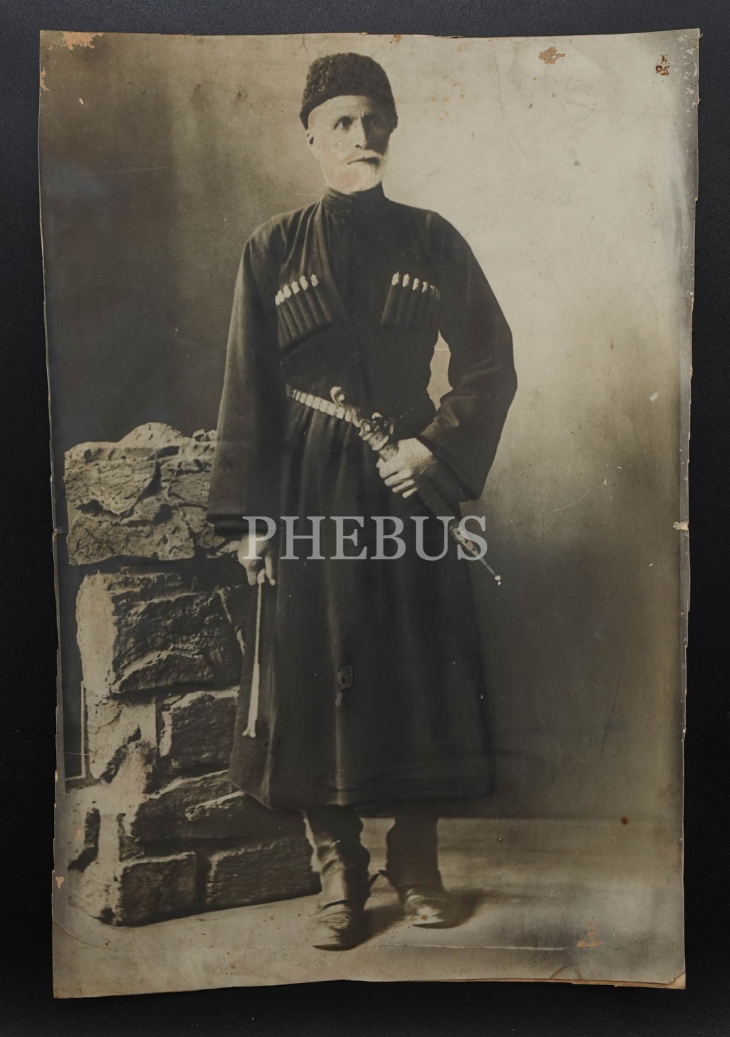 Kafkas kıyafetiyle poz veren beyefendinin büyük boy stüdyo hatıra fotoğrafı, 26x39 cm...