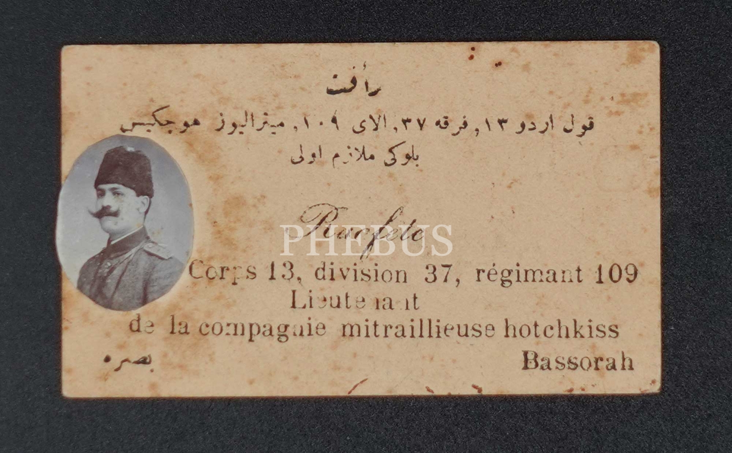 13. Kolordu 37. Fırka 109. Alay Hoçkis(Hotckiss) Mitralyöz Bölüğü Mülaım-ı Evveli Rafet Bey´in fotoğraflı kartviziti, 9x5 cm...