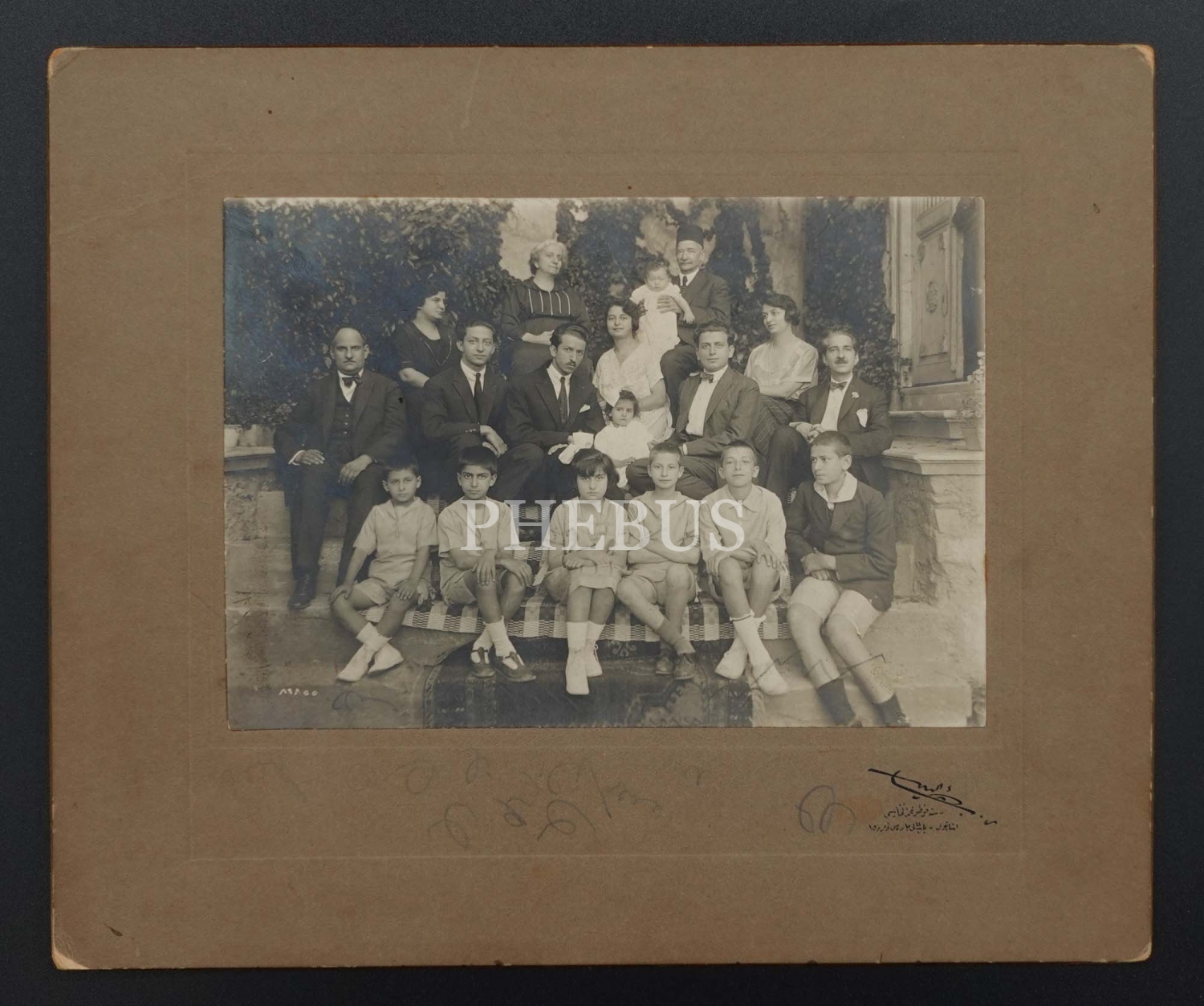 Şık giyimli bir ailenin köşkleri önünde aldırdığı hatıra fotoğrafı, Foto Resna (Rahmizade Bahaeddin Bediz) imzalı yer alan paspartusuyla birlikte 25x21 cm...
