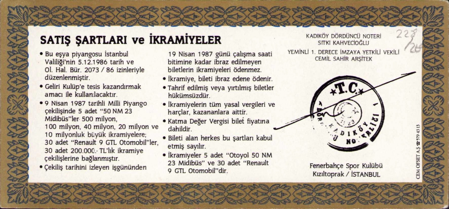 Fenerbahçe Spor Kulübü Eşya Piyangosu 1987, 14x6 cm