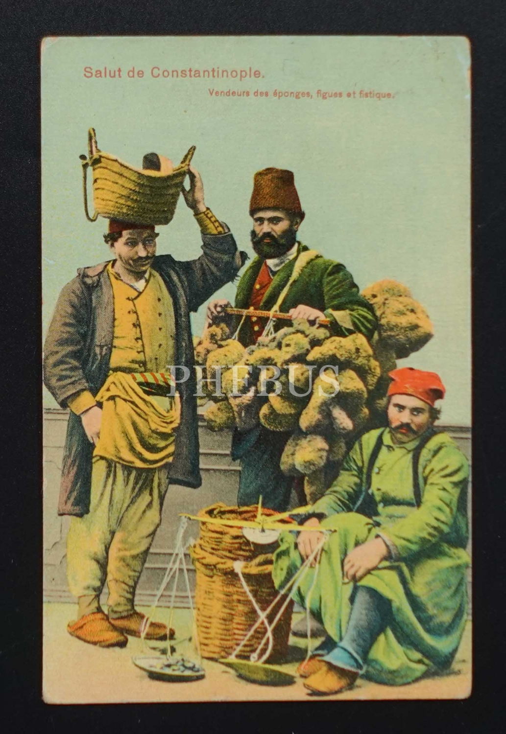 Seyyar sünger, incir ve fıstık satıcıları, "Vendeurs des eponges, figues et fistique", 9x14 cm...