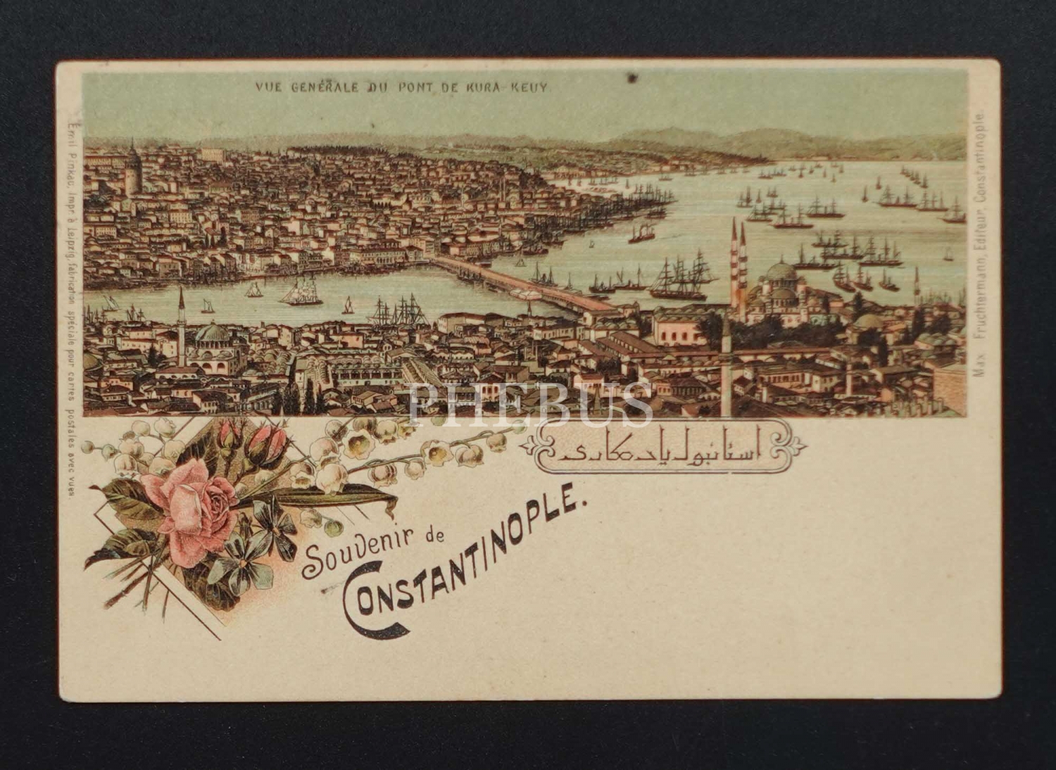 Karaköy Köprüsü´ne panoramik bakış, "Vue Generale du Pont de Kura-Keuy", ed. Emil Pinkau, Leipzig, 14x9 cm...