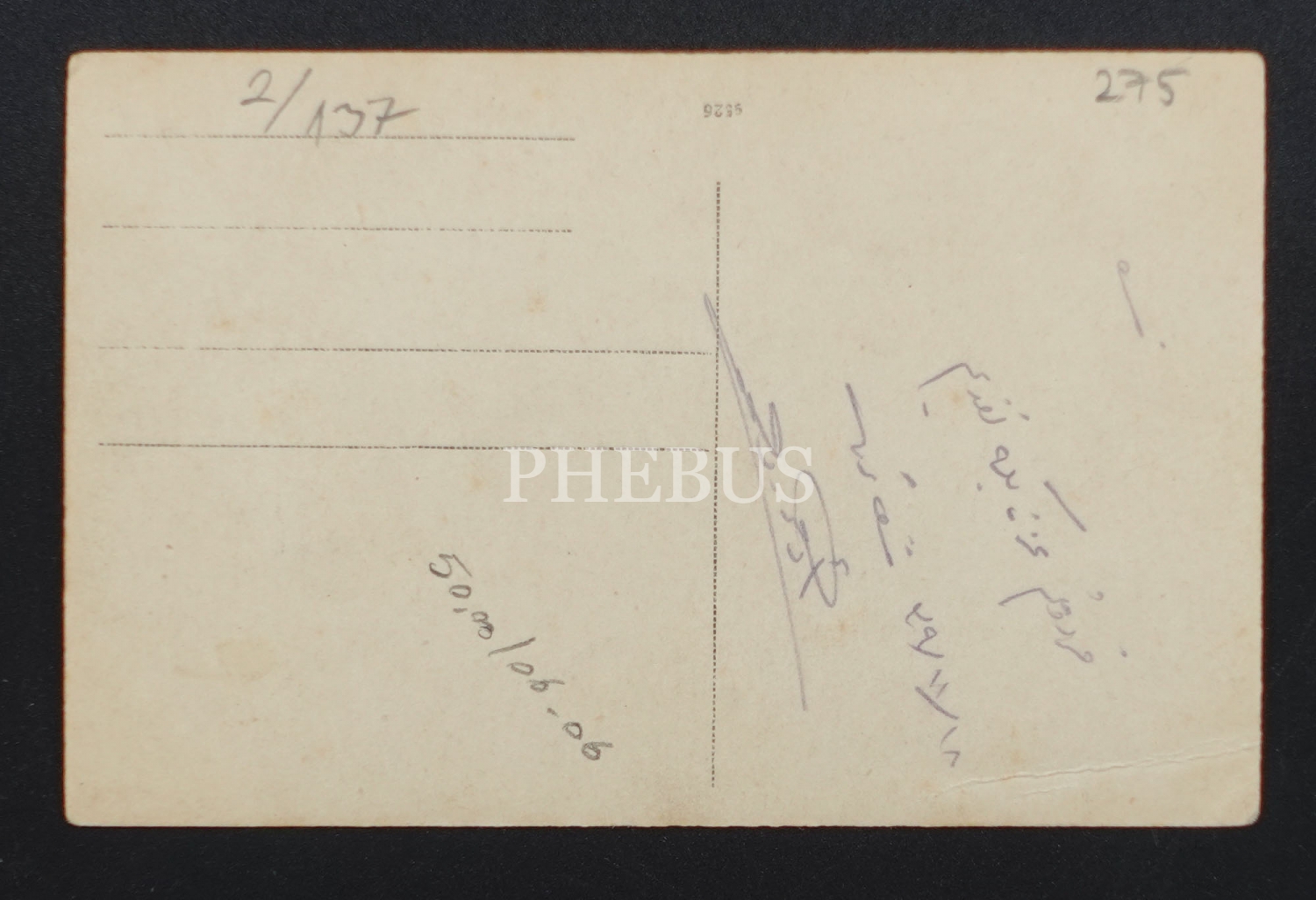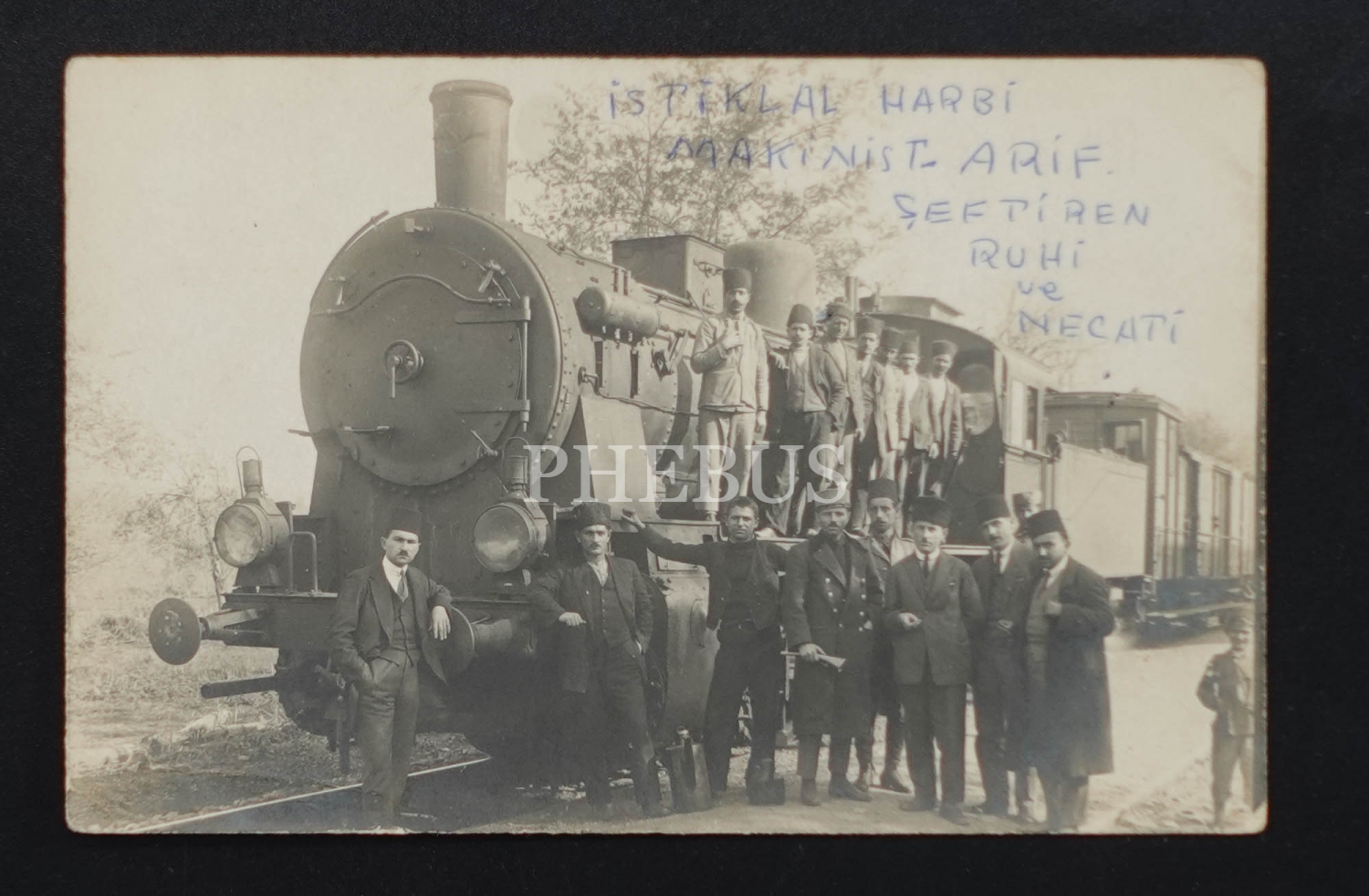 İstiklal Harbi yıllarından bir lokomotifin önünde hatıra fotoğrafı çektiren personel ve sivil erkan, 14x9 cm...